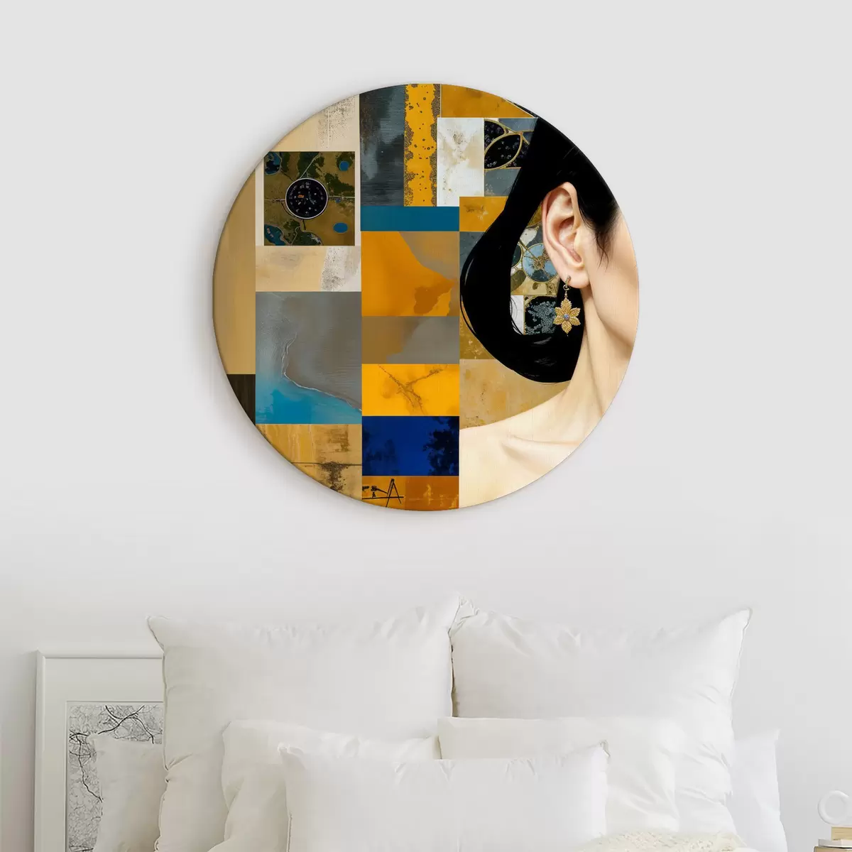 Ronde schilderijen Abstracte geometrische compositie met vrouwen en verschillende vormen, texturen en kleuren Nr r40016