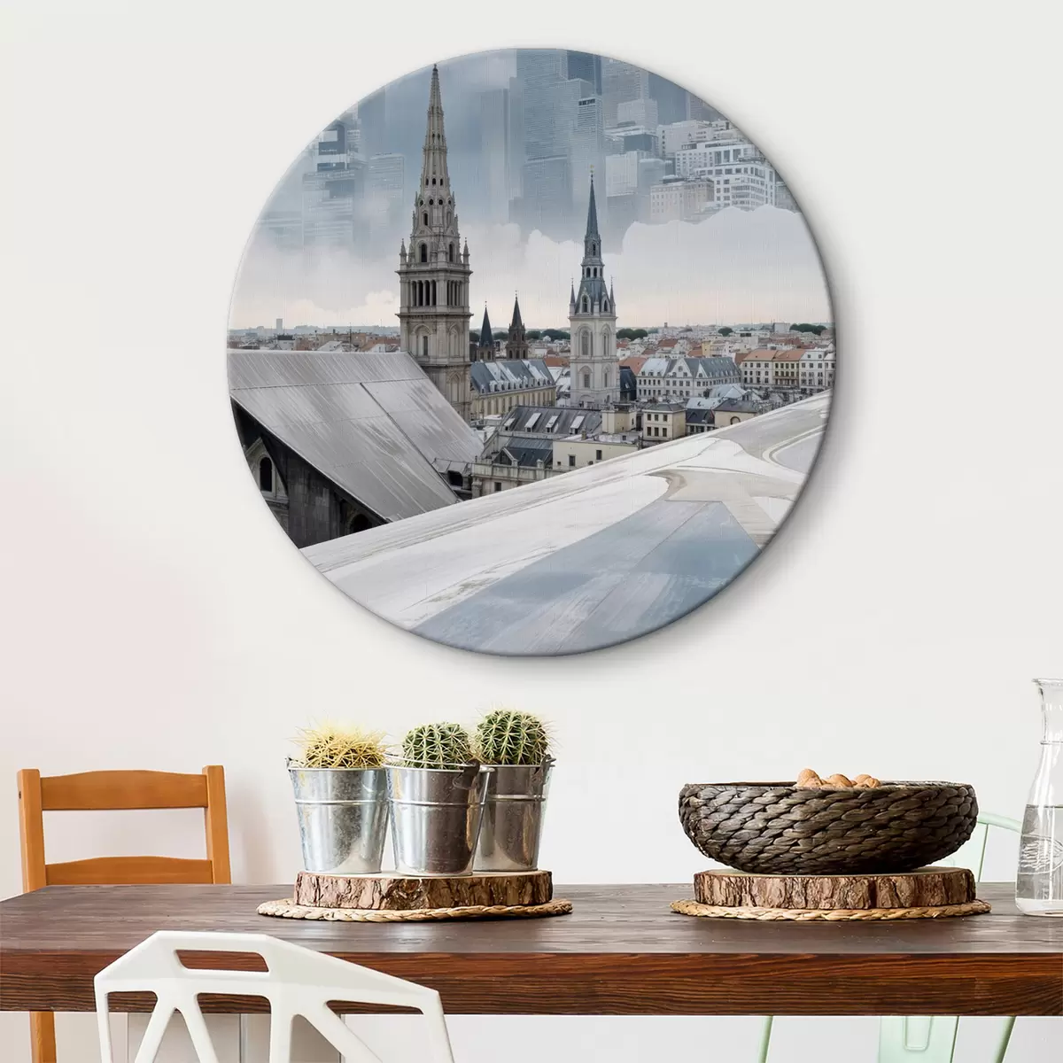 Ronde schilderijen Abstract stadsgezicht met een kathedraal en torenspitsen op de voorgrond, omringd door wolkenkrabbers Nr r40017