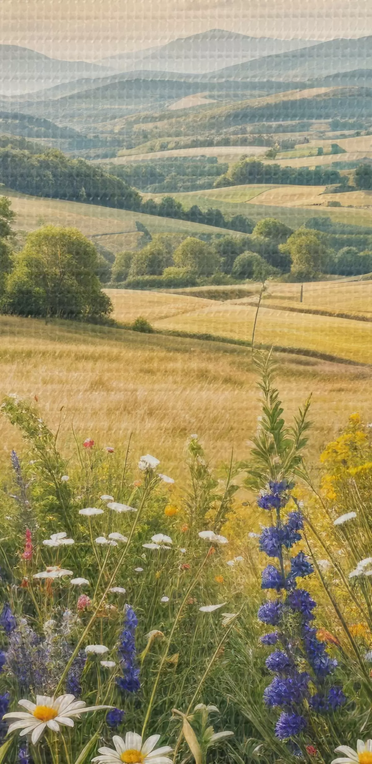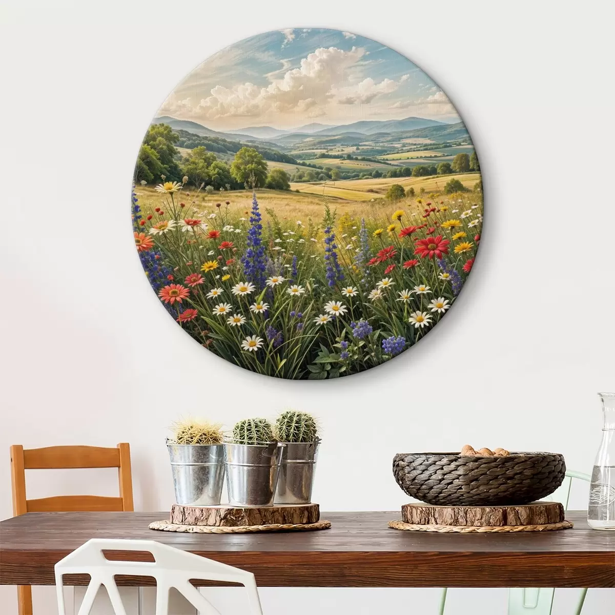 Ronde schilderijen Een weelderig landschap met een levendige wilde bloemenweide vol kleurrijke bloemen onder een bewolkte lucht Nr r40018