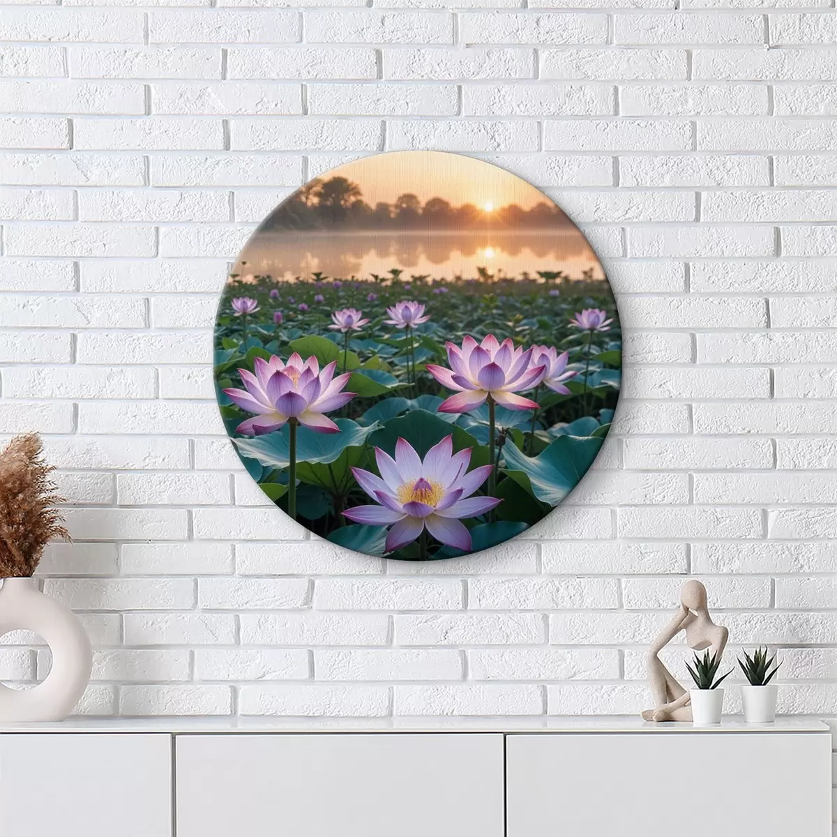 Ronde schilderijen Een veld met roze lotusbloemen die bloeien op een mistig meer bij zonsondergang, met palmbomen als silhouetten op de achtergrond Nr r40020