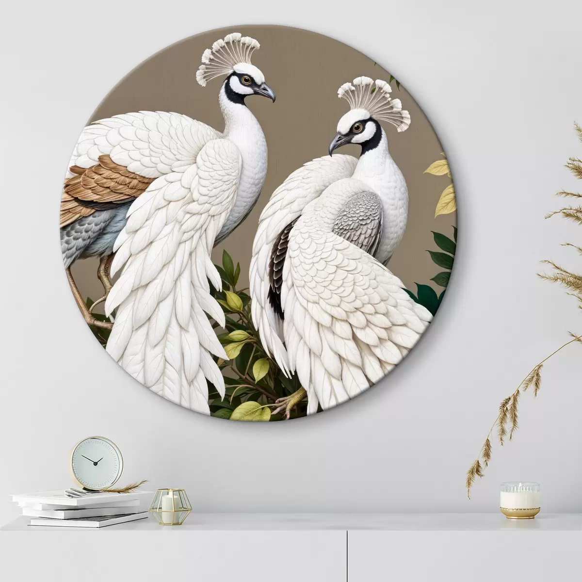 Ronde schilderijen Twee witte pauwen met sierlijke veren zitten op een tak met bloemen Nr r40022