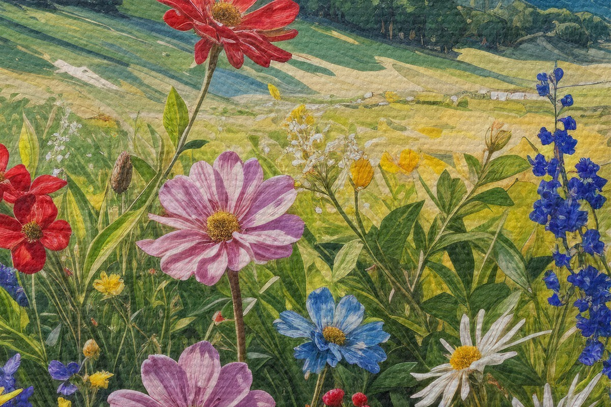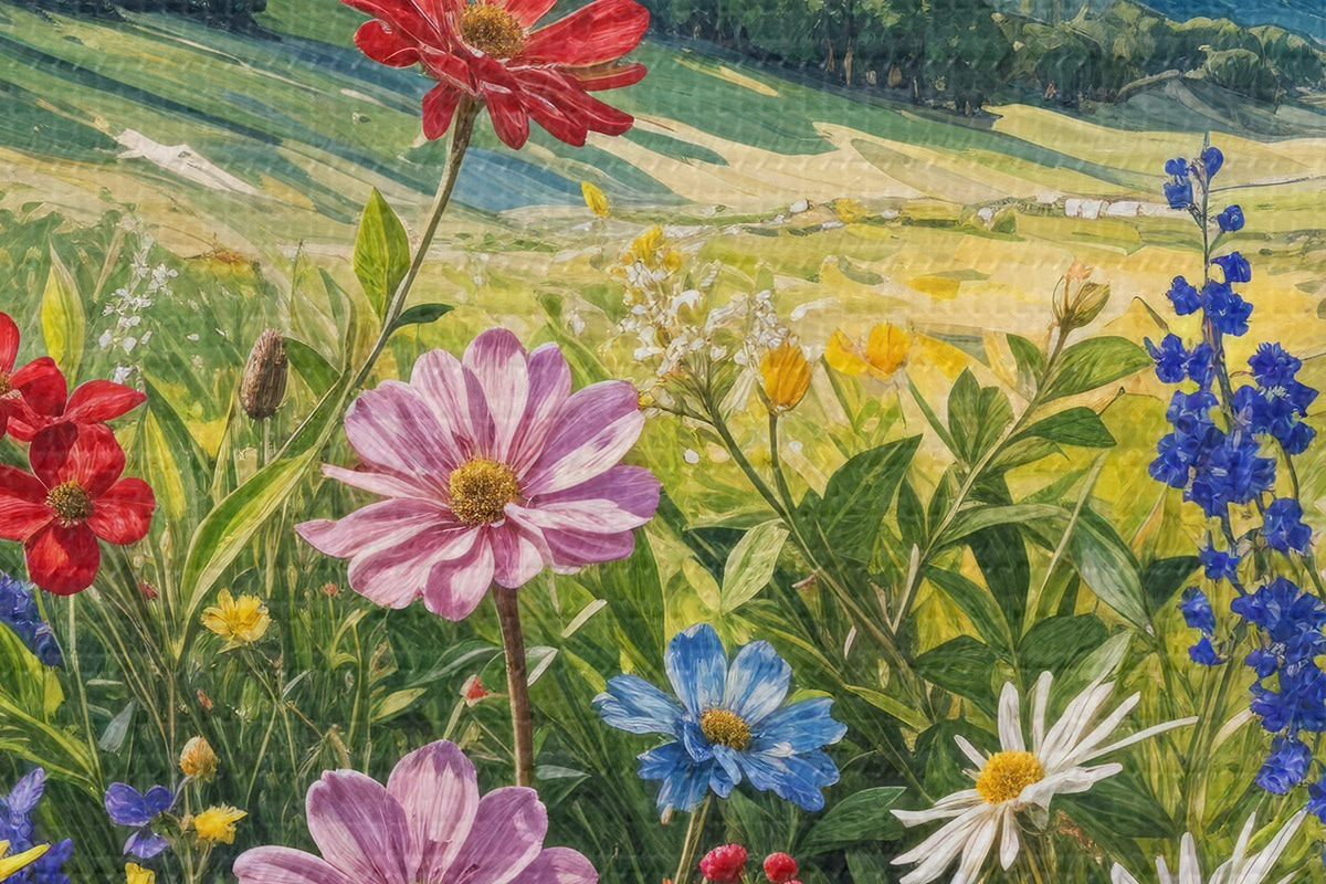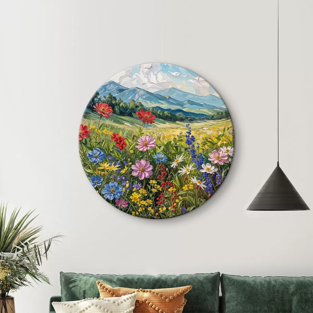 Ronde schilderijen Een levendig veld met kleurrijke wilde bloemen in bloei tegen glooiende heuvels en bergen onder een bewolkte lucht Nr r40029