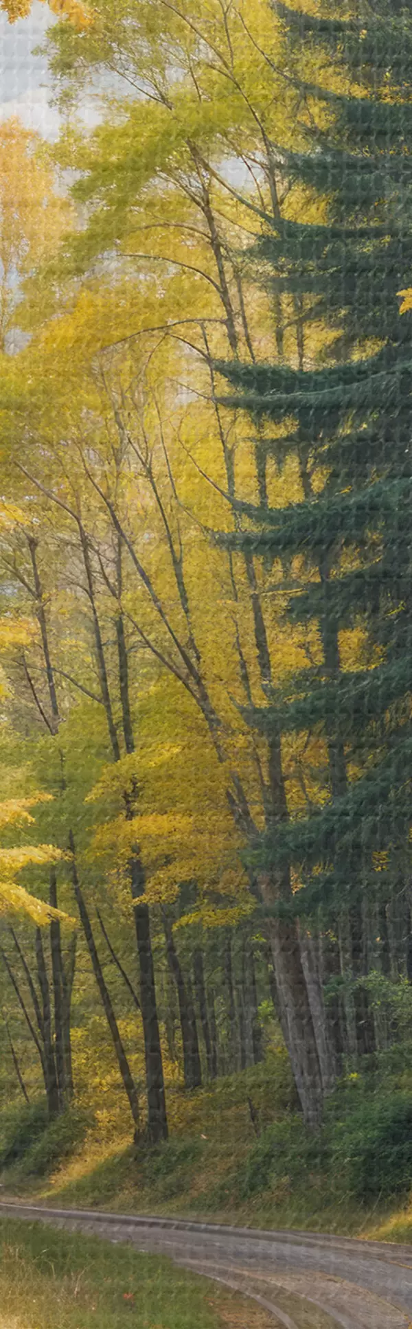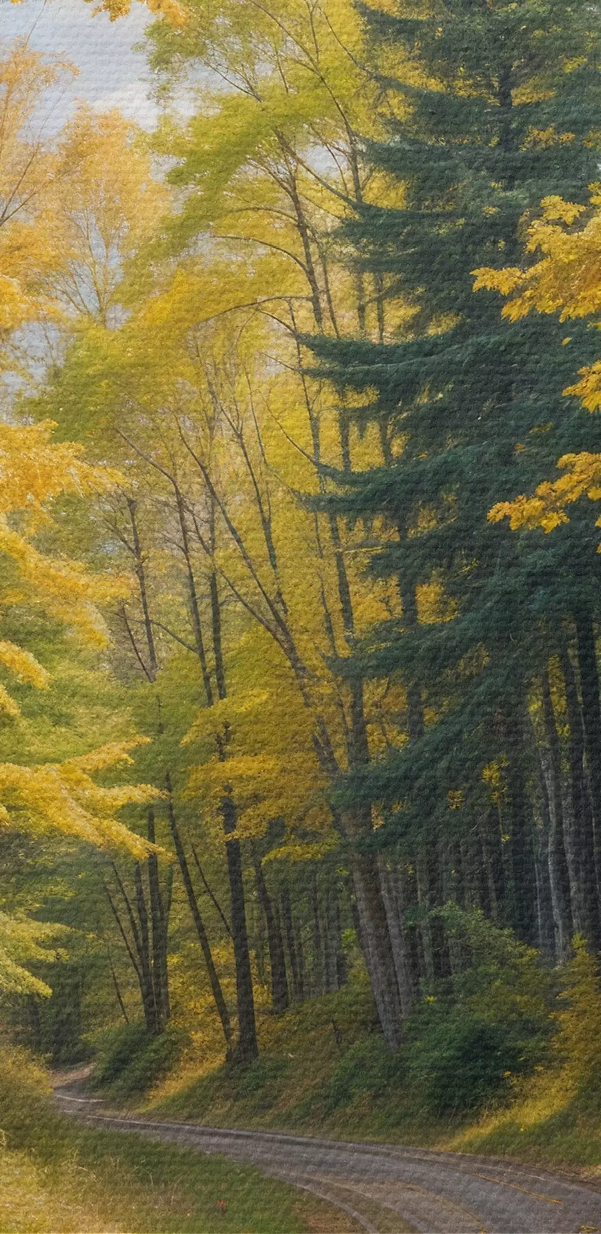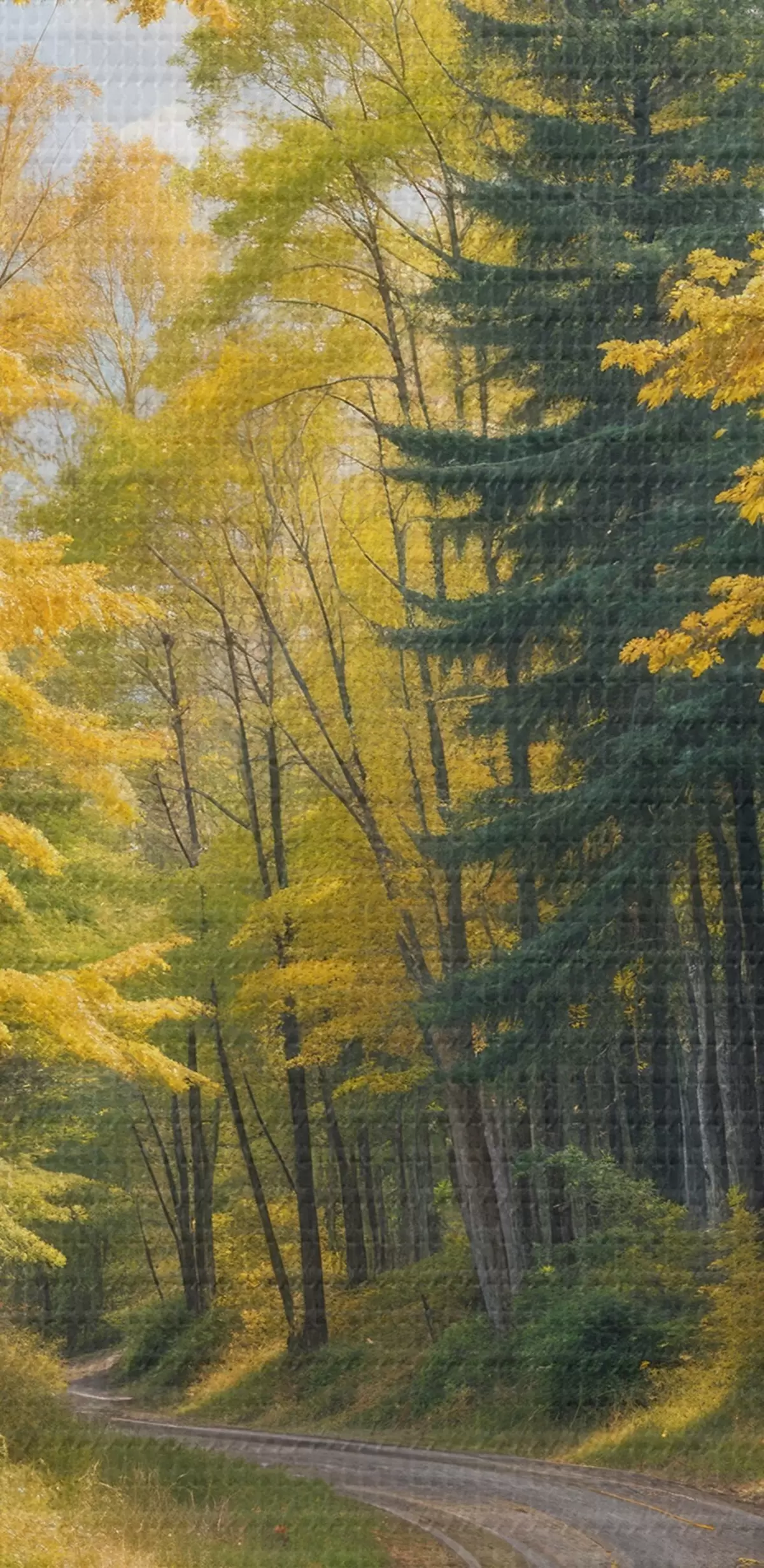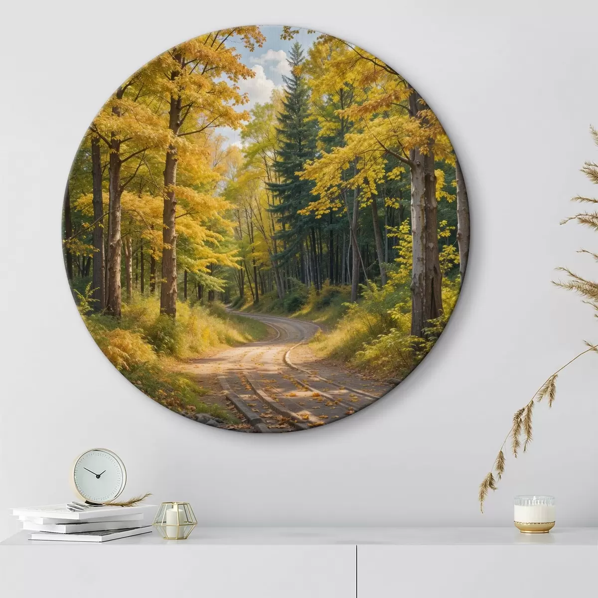 Ronde schilderijen Een onverharde weg die door een bos slingert in de herfst, met hoge bomen aan beide kanten Nr r40031
