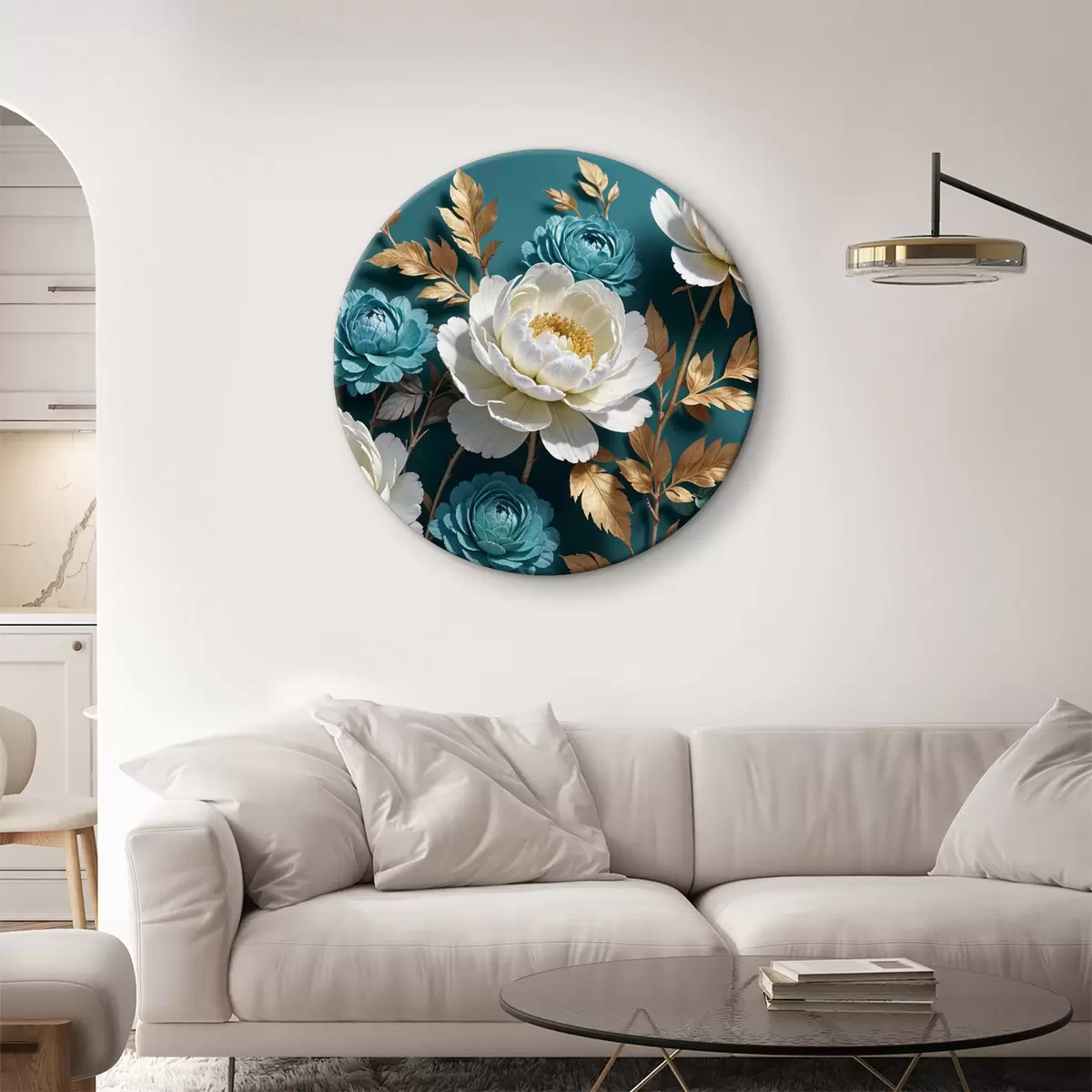 Ronde schilderijen Een boeket van grote witte en blauwgroene pioenrozen met gele bladeren tegen een blauwgroene achtergrond r40036