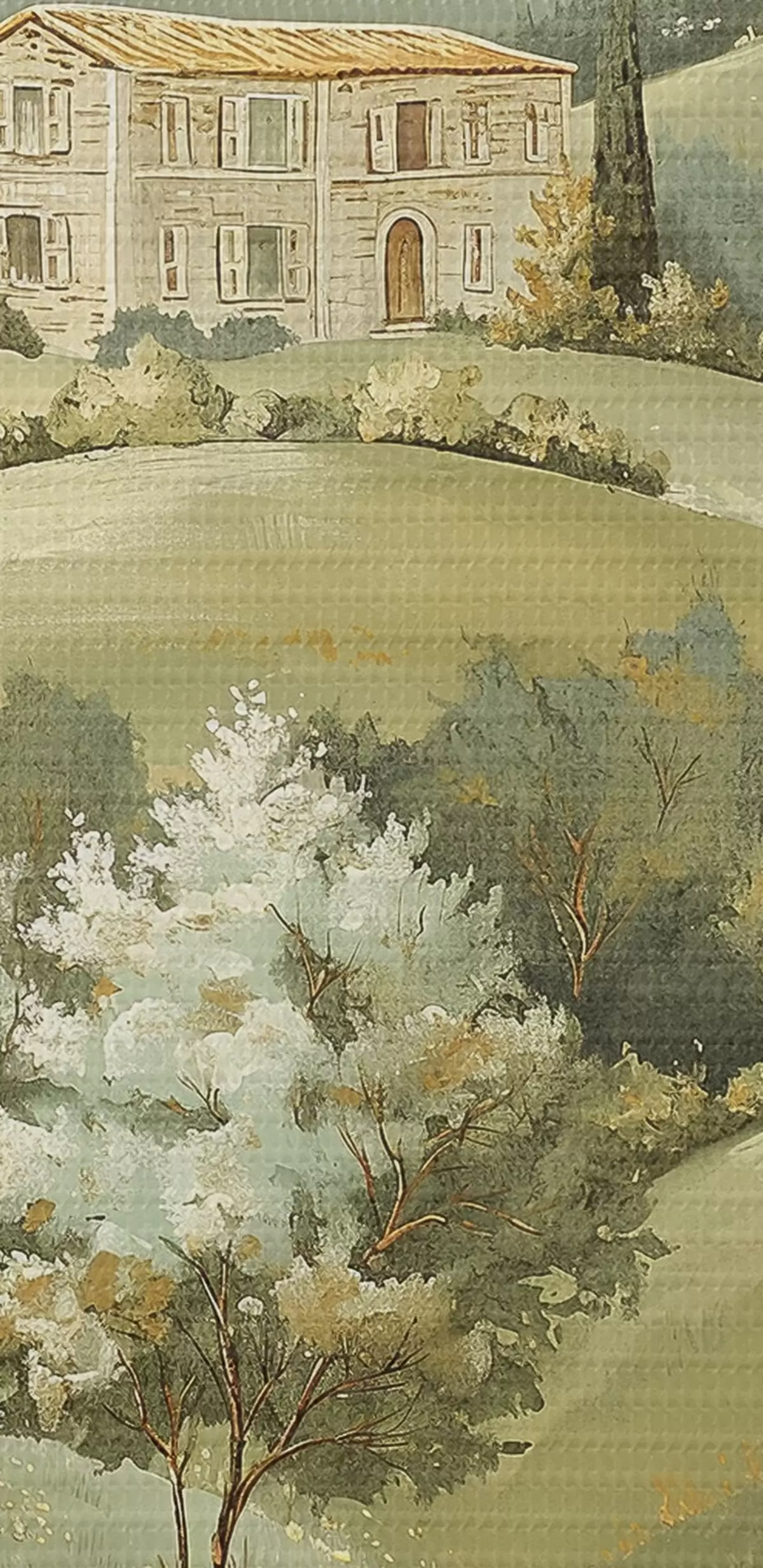 Ronde schilderijen Landschap met vintage huizen, pastelgroene kleuren, acryltekening, zomer Nr r40078
