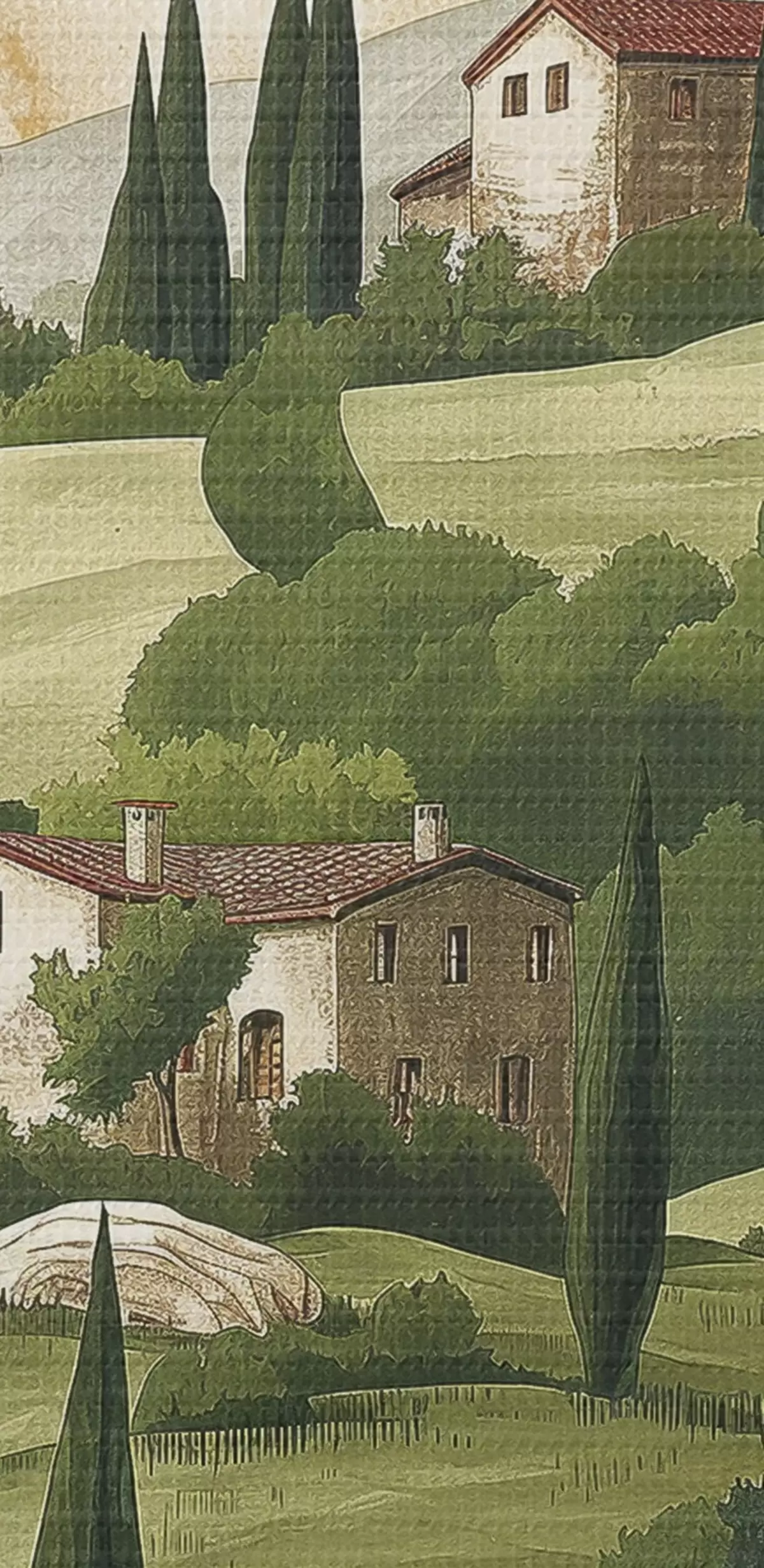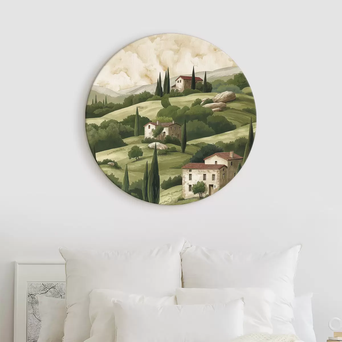 Ronde schilderijen Landschap met vintage huizen, pastelgroene kleuren, acryltekening, rustiek r40080