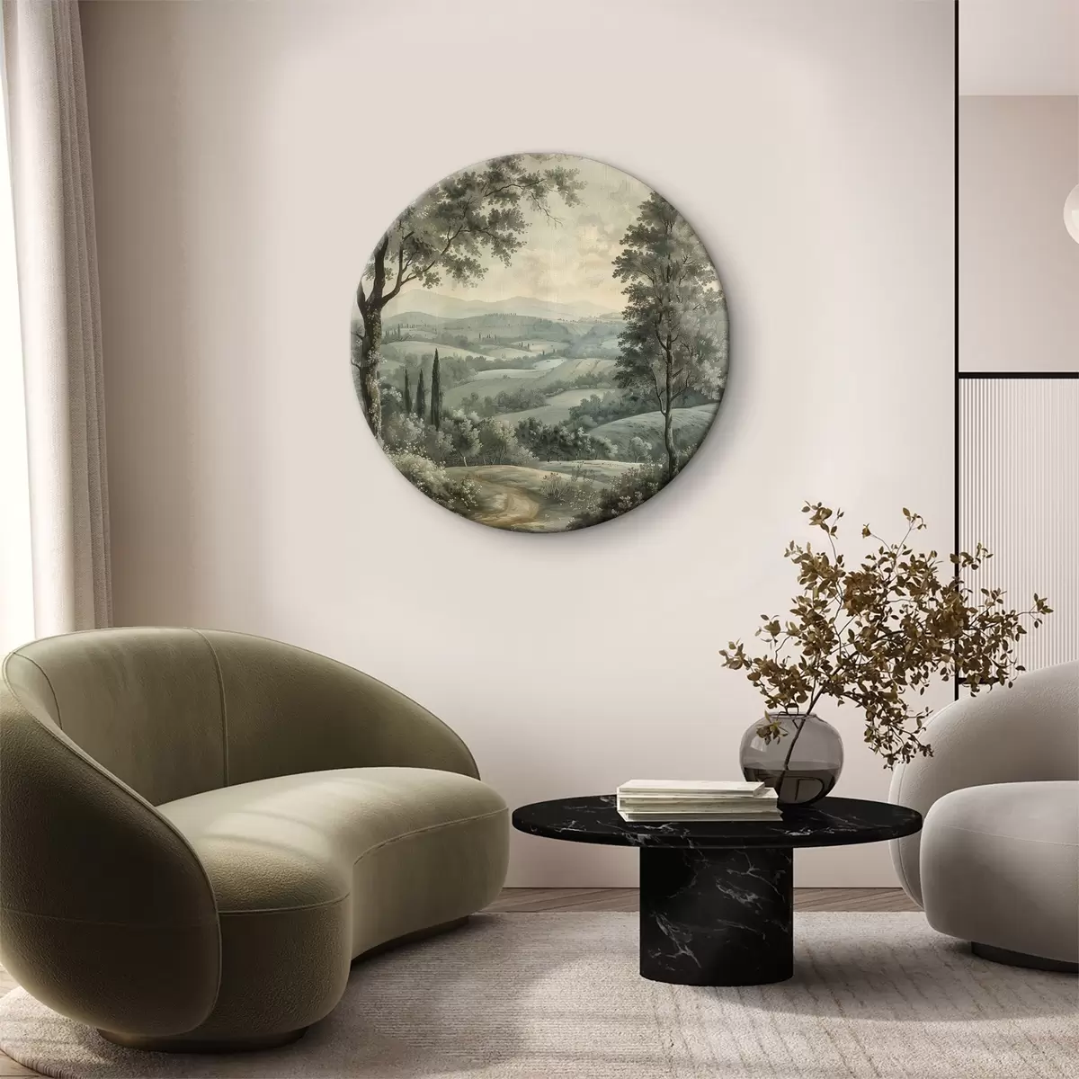 Ronde schilderijen Vintage Italiaans landschap, rustieke stijl, pastelkleuren, heuvels met bomen, boho Nr r40086