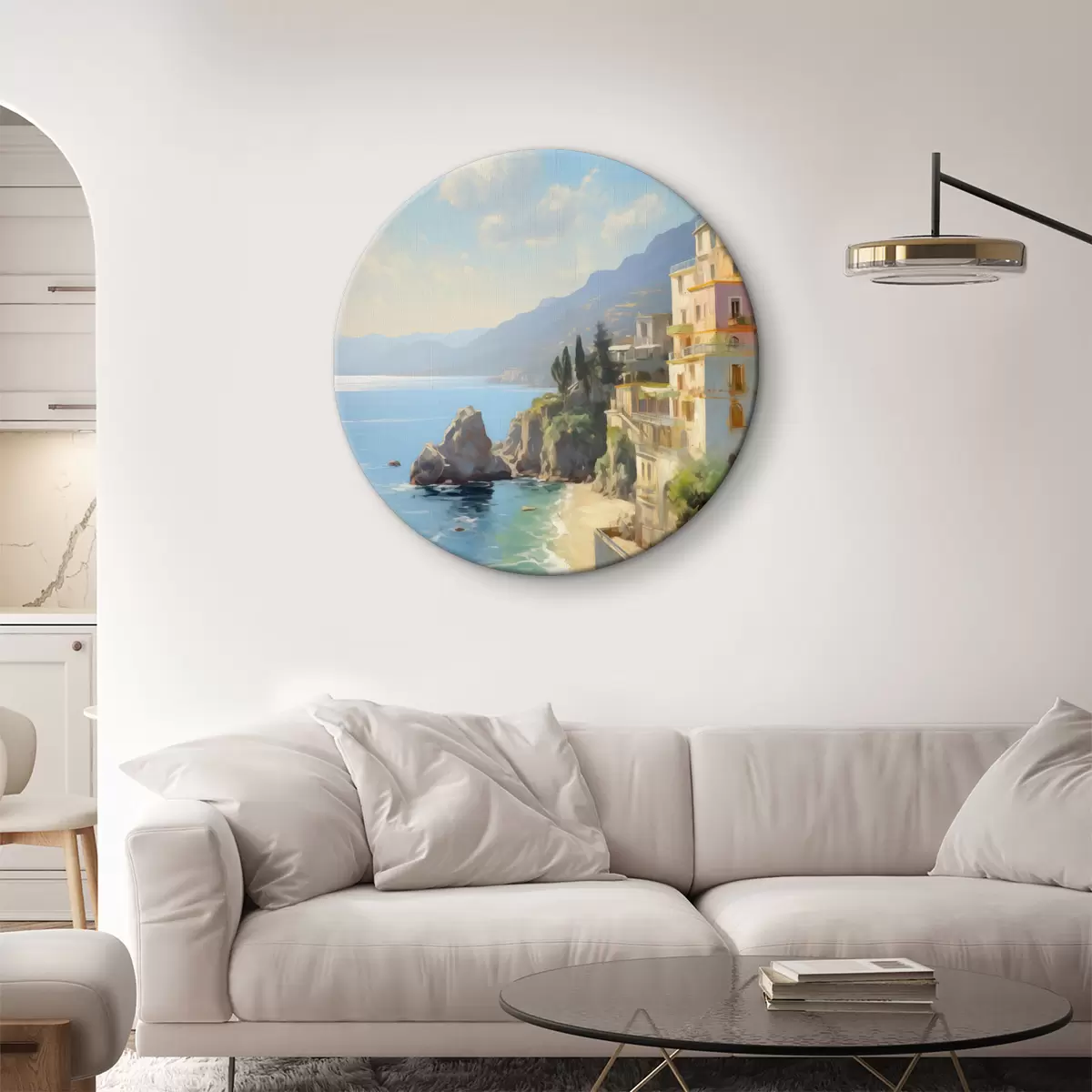 Ronde schilderijen Uitzicht op de zeebaai, bergen in Italië vanuit het hotel imitatie van olieverfschilderij r40088