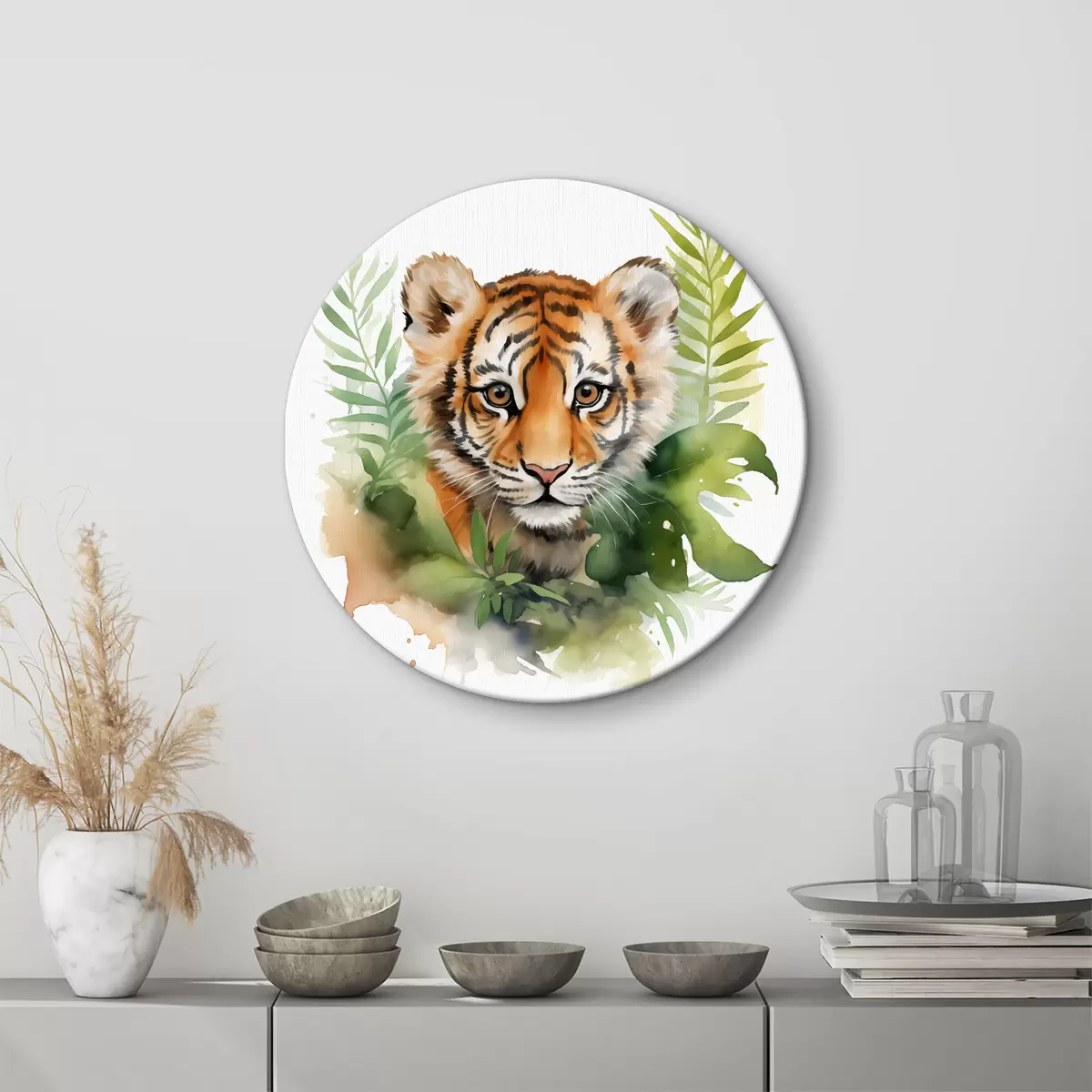 Ronde schilderijen Portret van een tijger in tropische bladeren aquarel Nr r40090