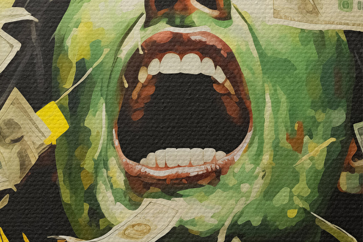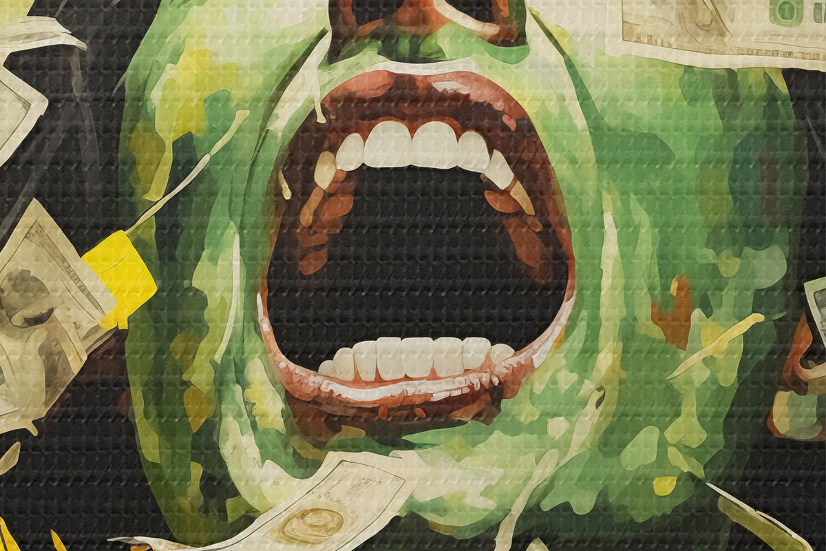 Ronde schilderijen Portret van groene vrouw op geel, schreeuw, papieren rekeningen, geld imitatie van olieverfschilderij r40096