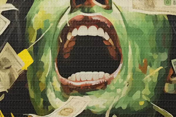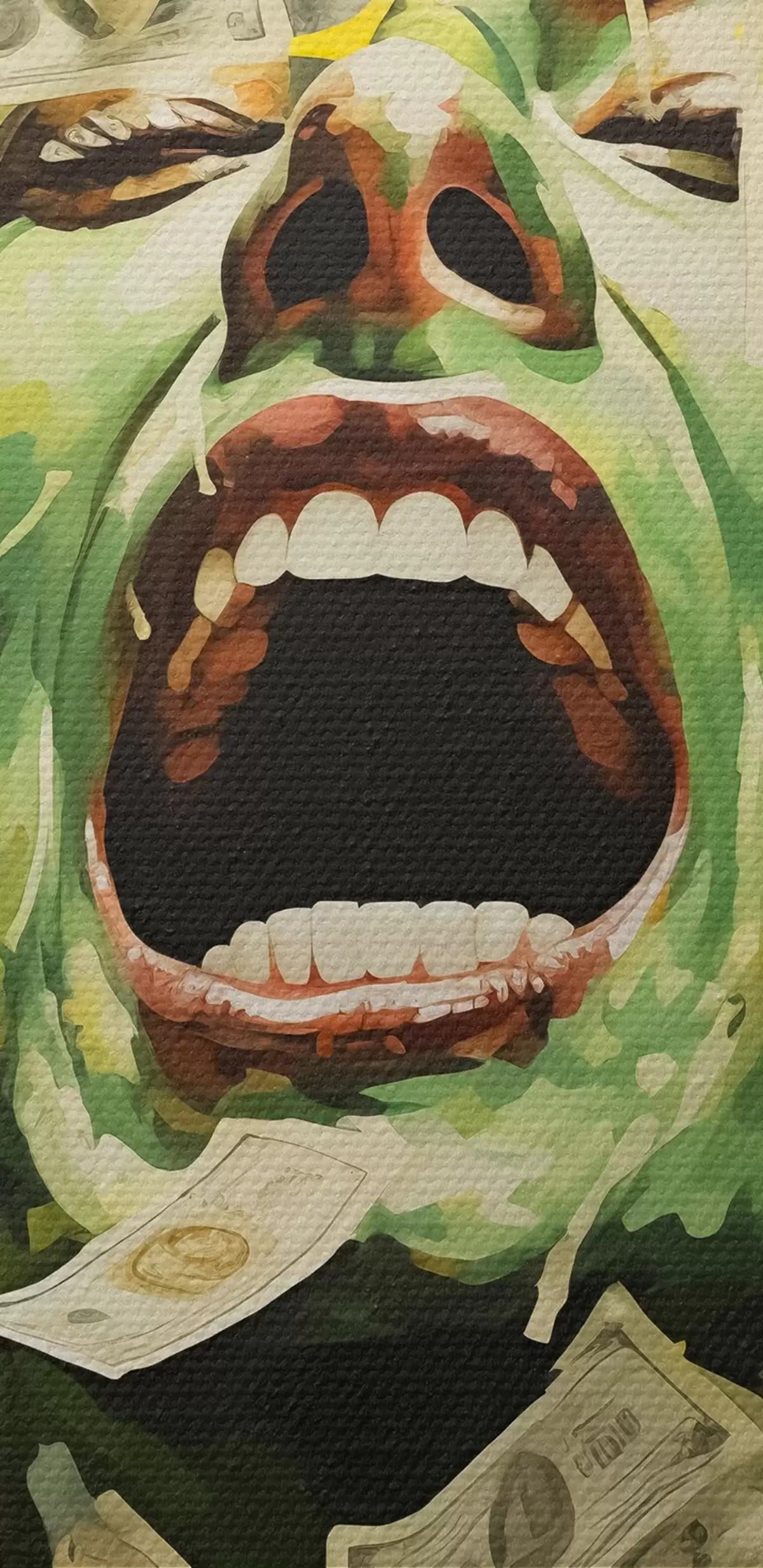 Ronde schilderijen Portret van groene vrouw op geel, schreeuw, papieren rekeningen, geld imitatie van olieverfschilderij Nr r40096