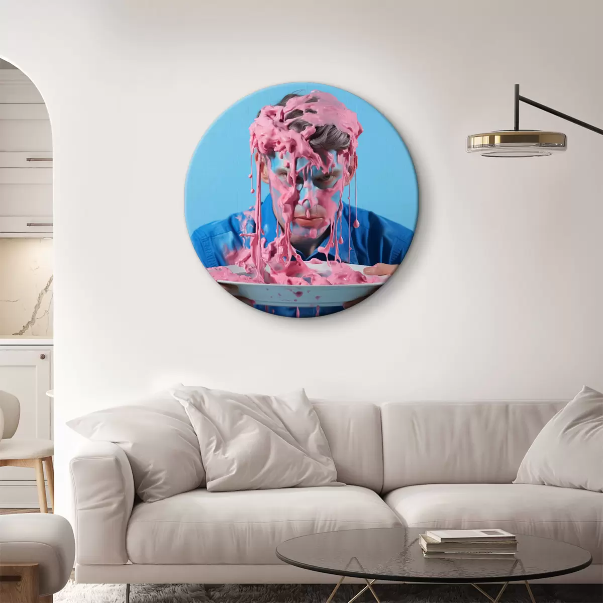 Ronde schilderijen Man op blauwe achtergrond in blauw shirt bedekt met roze verf Nr r40102