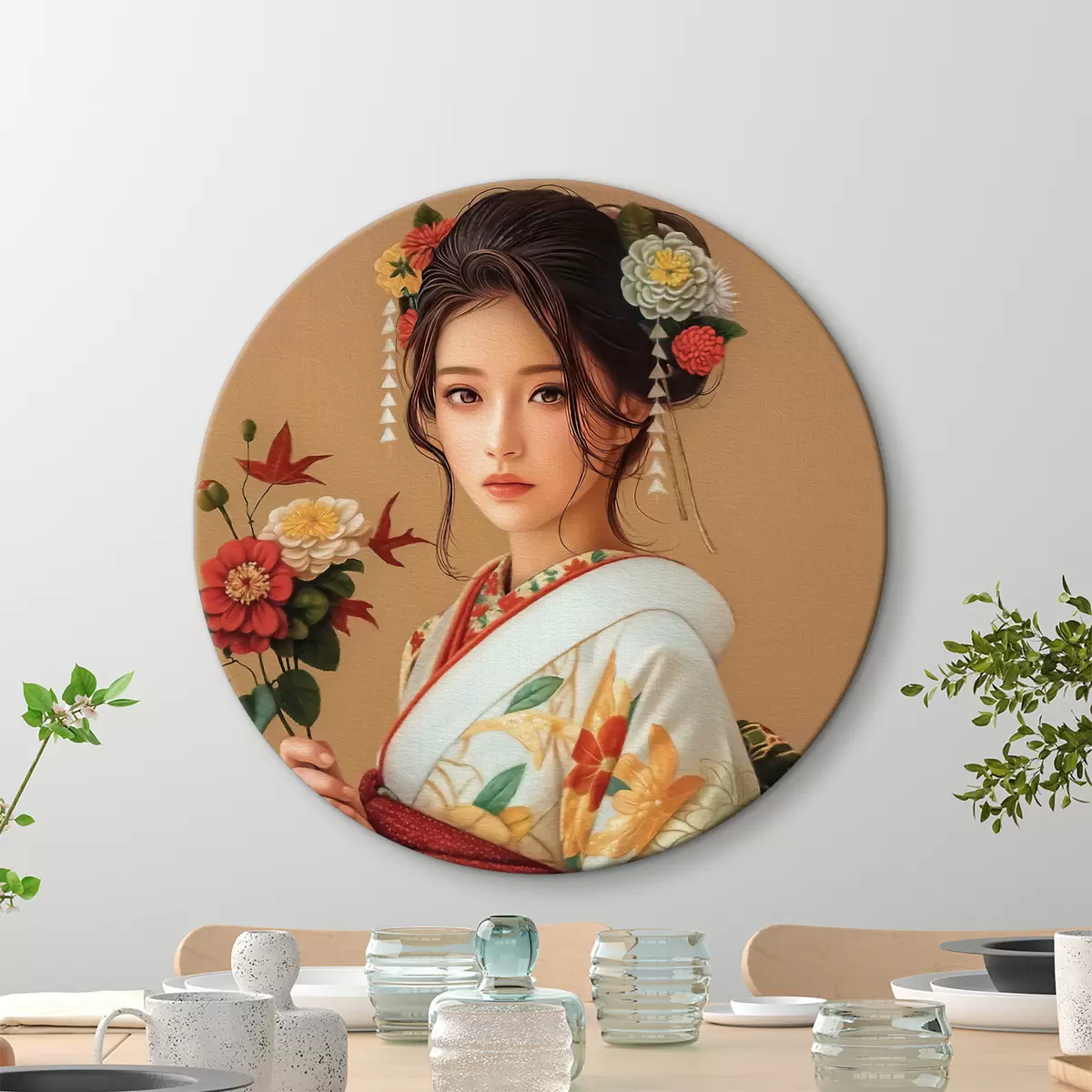 Ronde schilderijen Japanse vrouw in een prachtige kimono Nr r40108