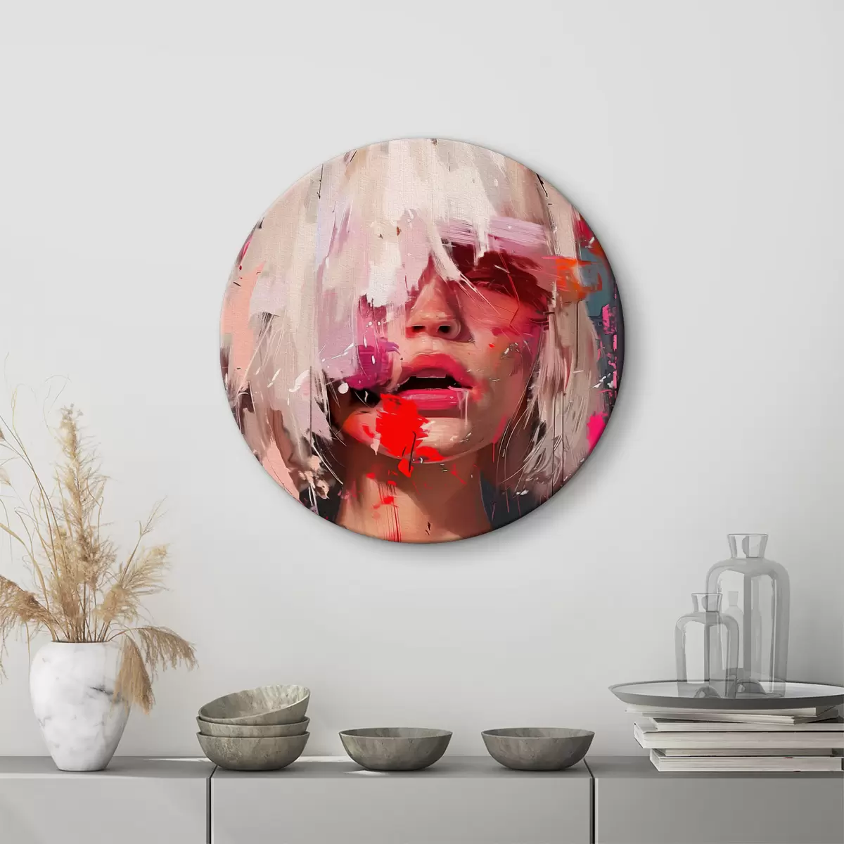 Ronde schilderijen Blond meisje met een vierkante bob en gekleurde verf r40110