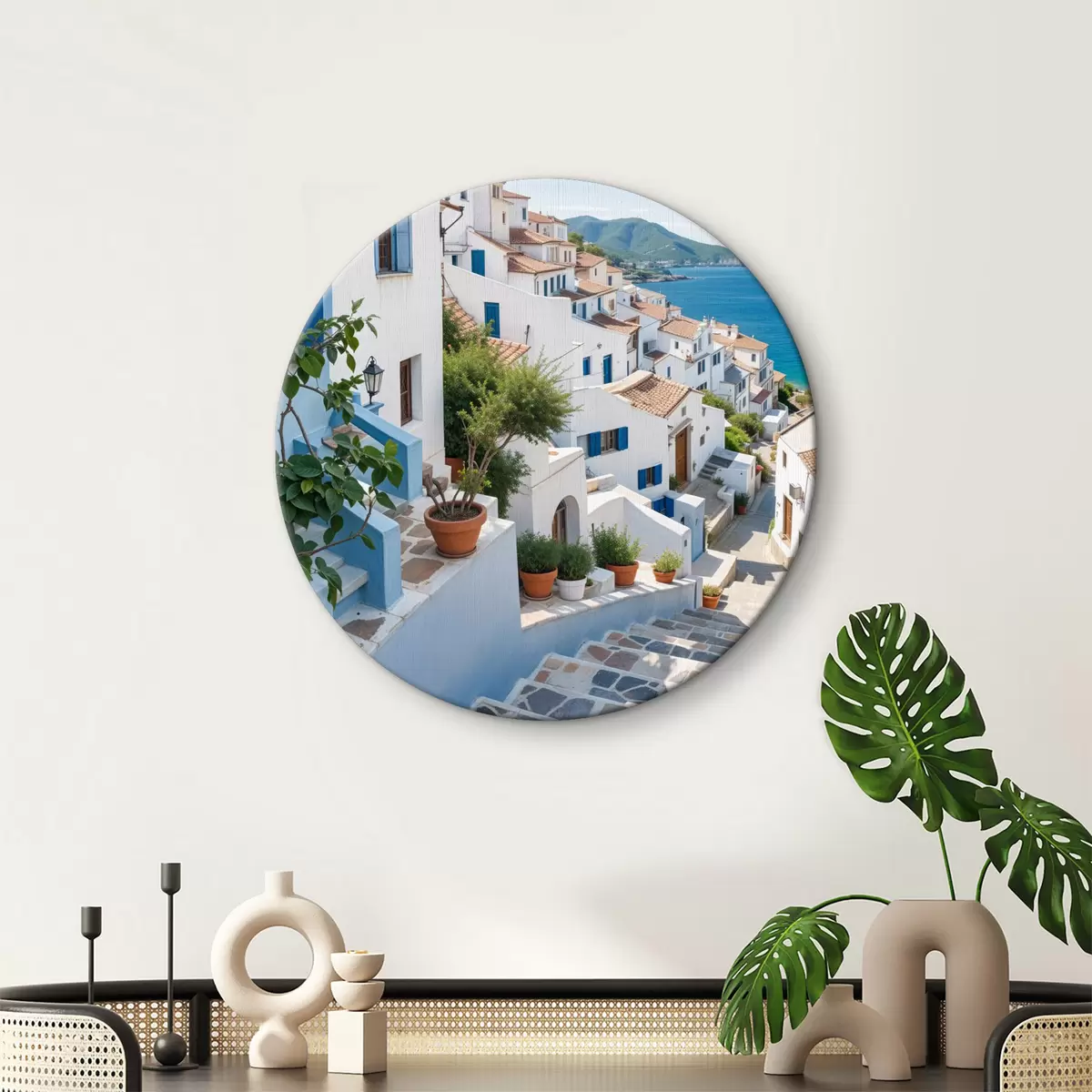 Ronde schilderijen Een pittoresk kustplaatsje met witte gebouwen, blauwe ramen en potplanten langs de smalle straatjes Nr r40148