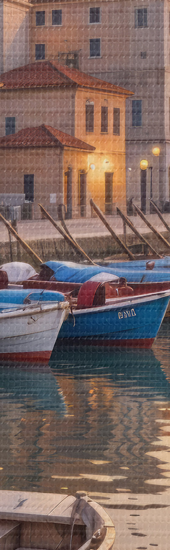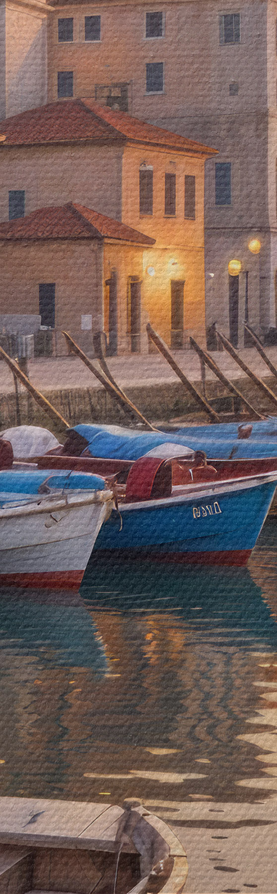 Ronde schilderijen Italiaanse kustplaats bij zonsondergang, met kleurrijke gebouwen langs de waterkant en boten die in het kalme water dobberen Nr r40150