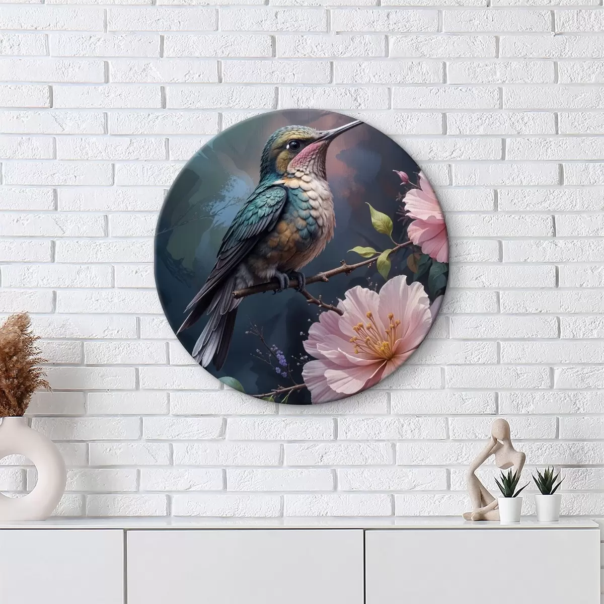 Ronde schilderijen Een kleurrijke kolibrie zit op een tak met op de achtergrond levendige roze bloemen Nr r40155