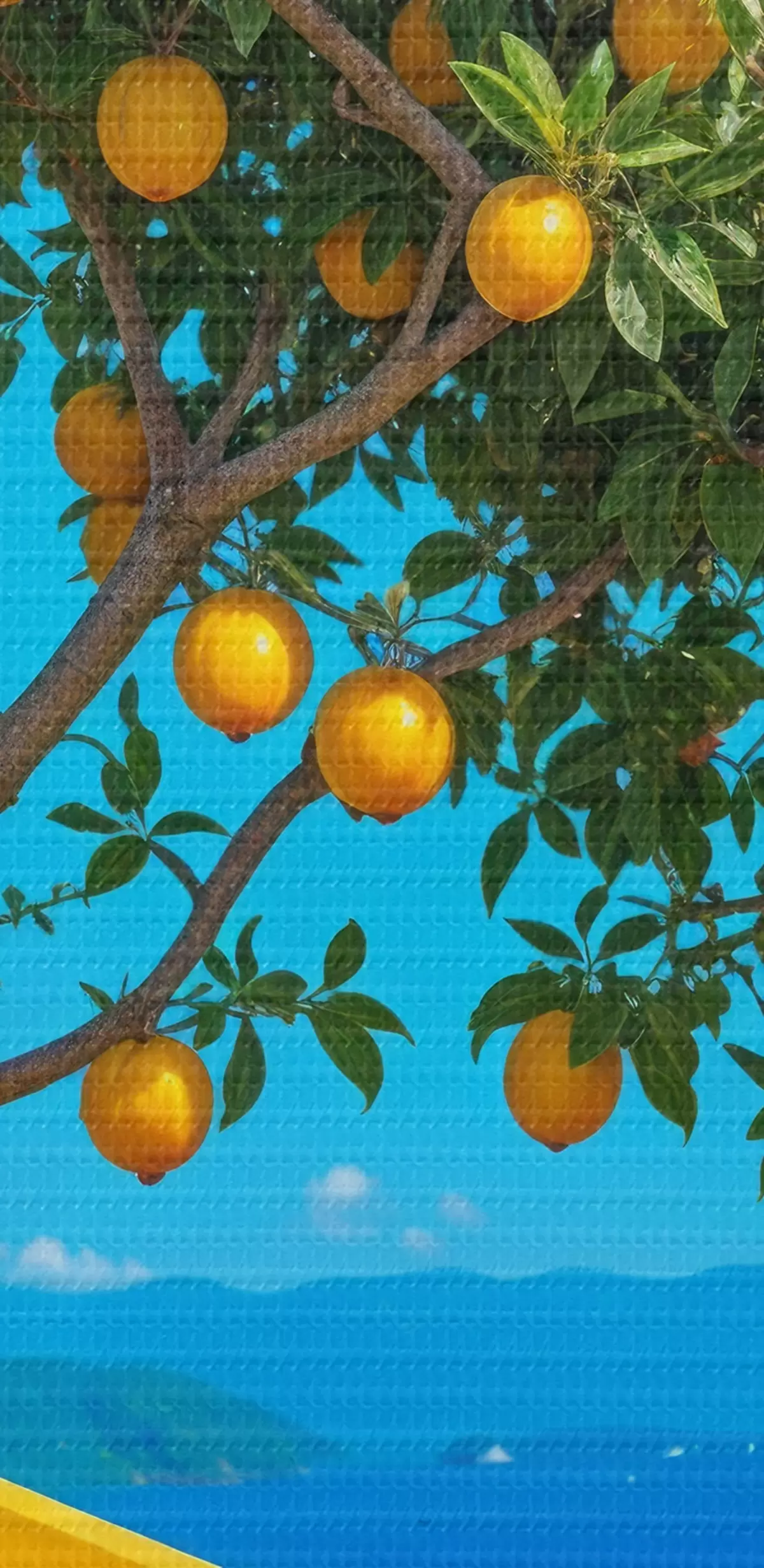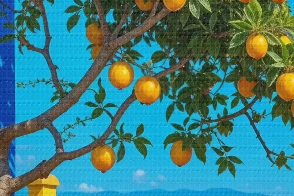 Ronde schilderijen Een sinaasappelboom met rijp fruit dat groeit op een gebouw met een blauwe muur en een betegeld dak met uitzicht op de oceaan Nr r40159