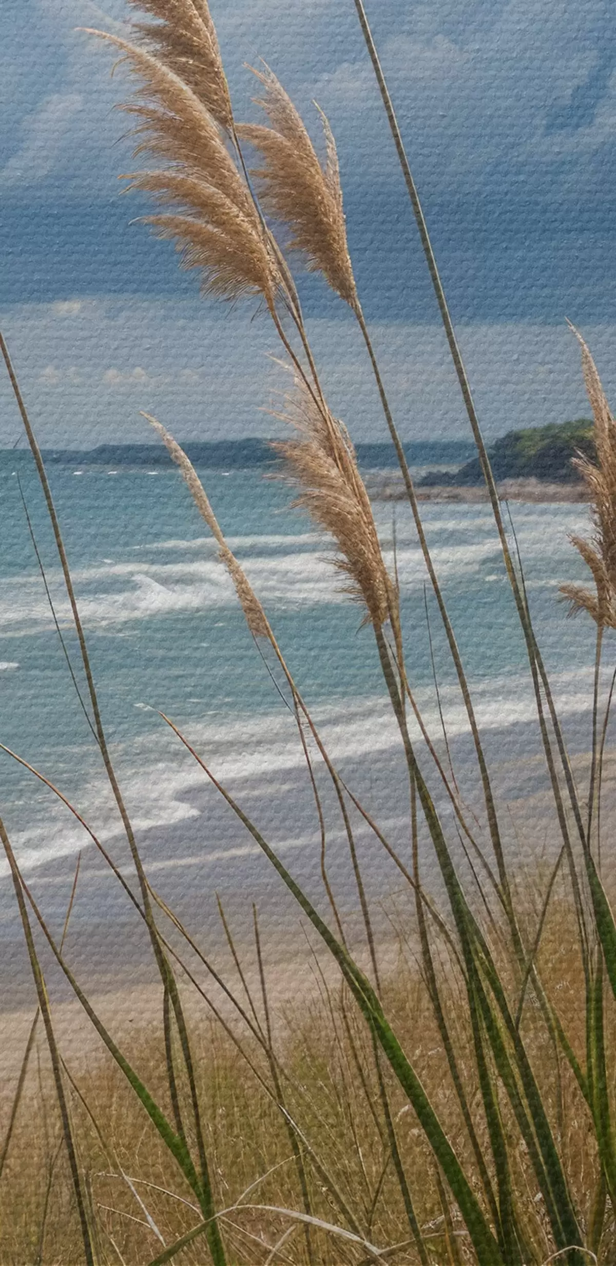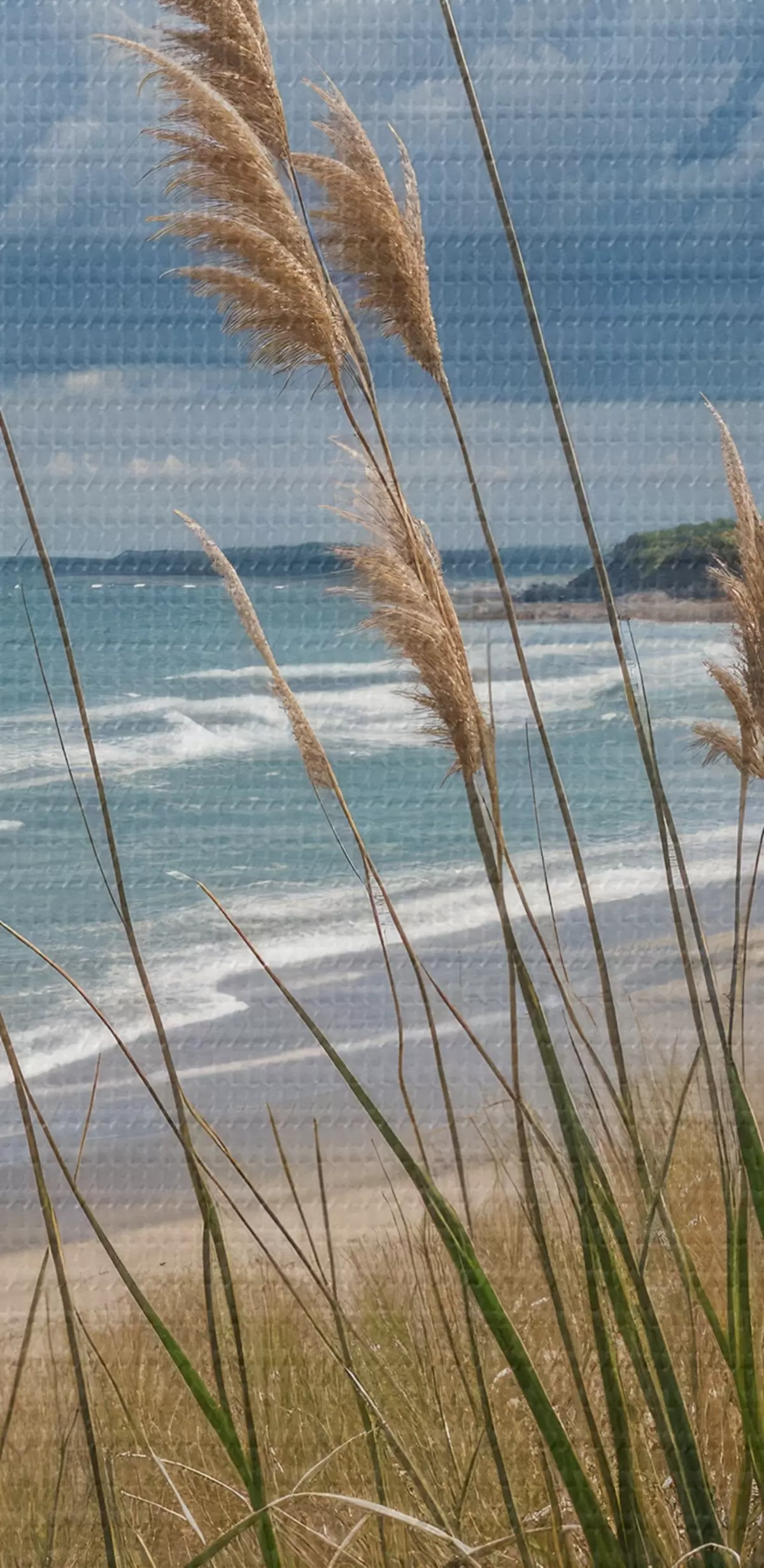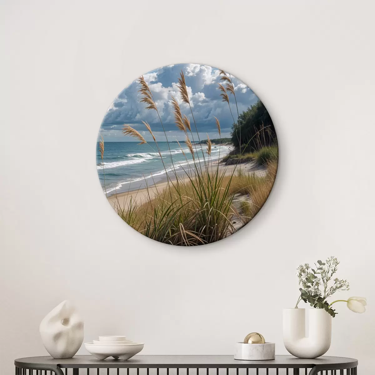 Ronde schilderijen Een schilderachtig strand met hoog gras dat in de wind wuift, met uitzicht op de oceaan met beukende golven en een bewolkte lucht Nr r40161