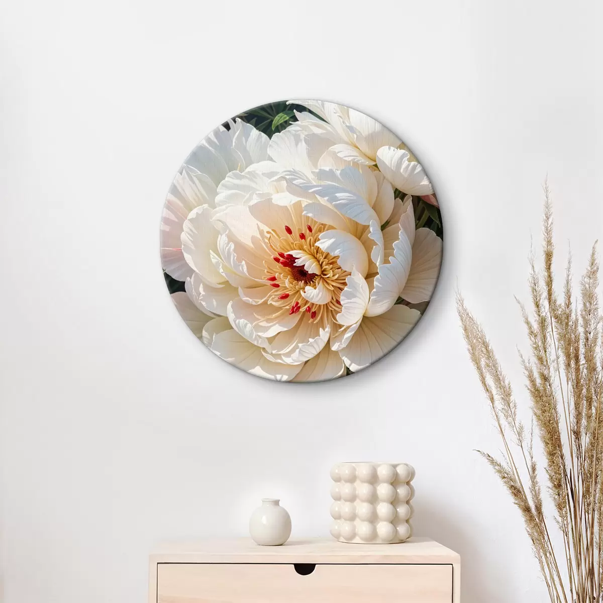 Ronde schilderijen Een close-up van verschillende grote, witte pioenrozenbloemen met delicate bloemblaadjes en levendige gele centra Nr r40164