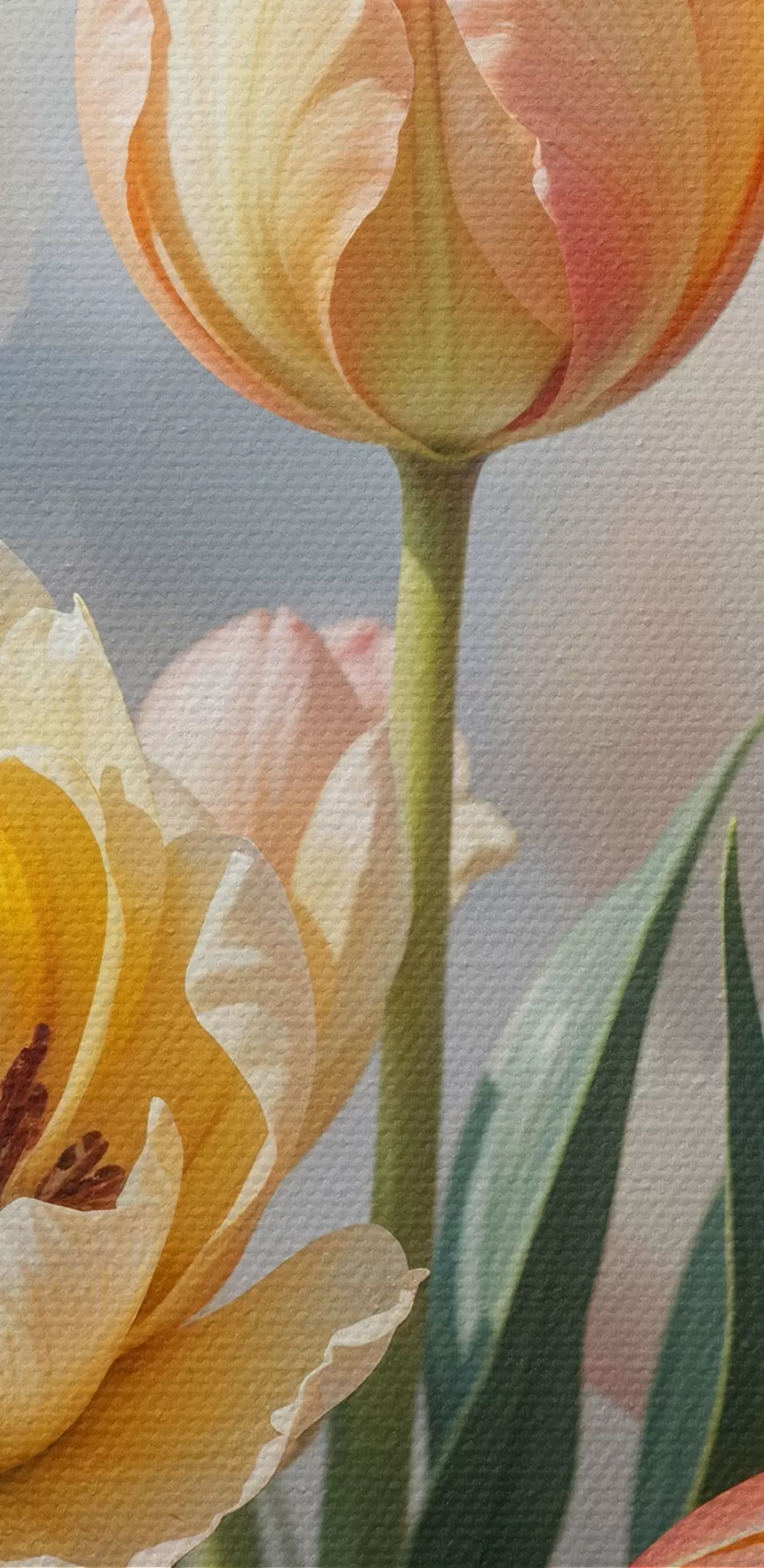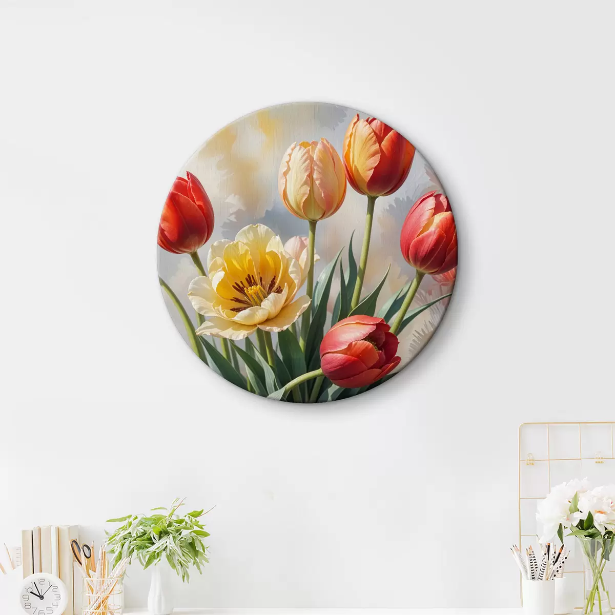 Ronde schilderijen Kleurrijke tulpen in verschillende tinten rood, oranje en geel tegen een lichte achtergrond Nr r40167