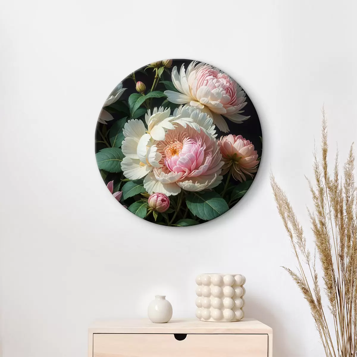 Ronde schilderijen Weelderige pioenrozenbloemen in tinten wit, roze en geel met delicate, gelaagde bloemblaadjes en groene bladeren Nr r40170