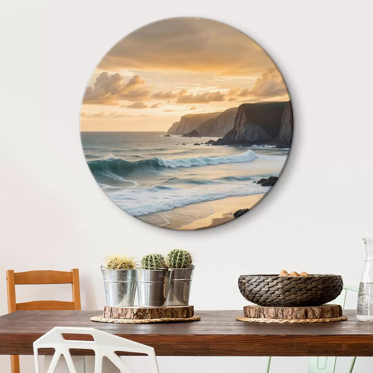 Ronde schilderijen Een schilderachtig kustlandschap met dramatische kliffen, beukende golven en een kleurrijke zonsonderganghemel r40176