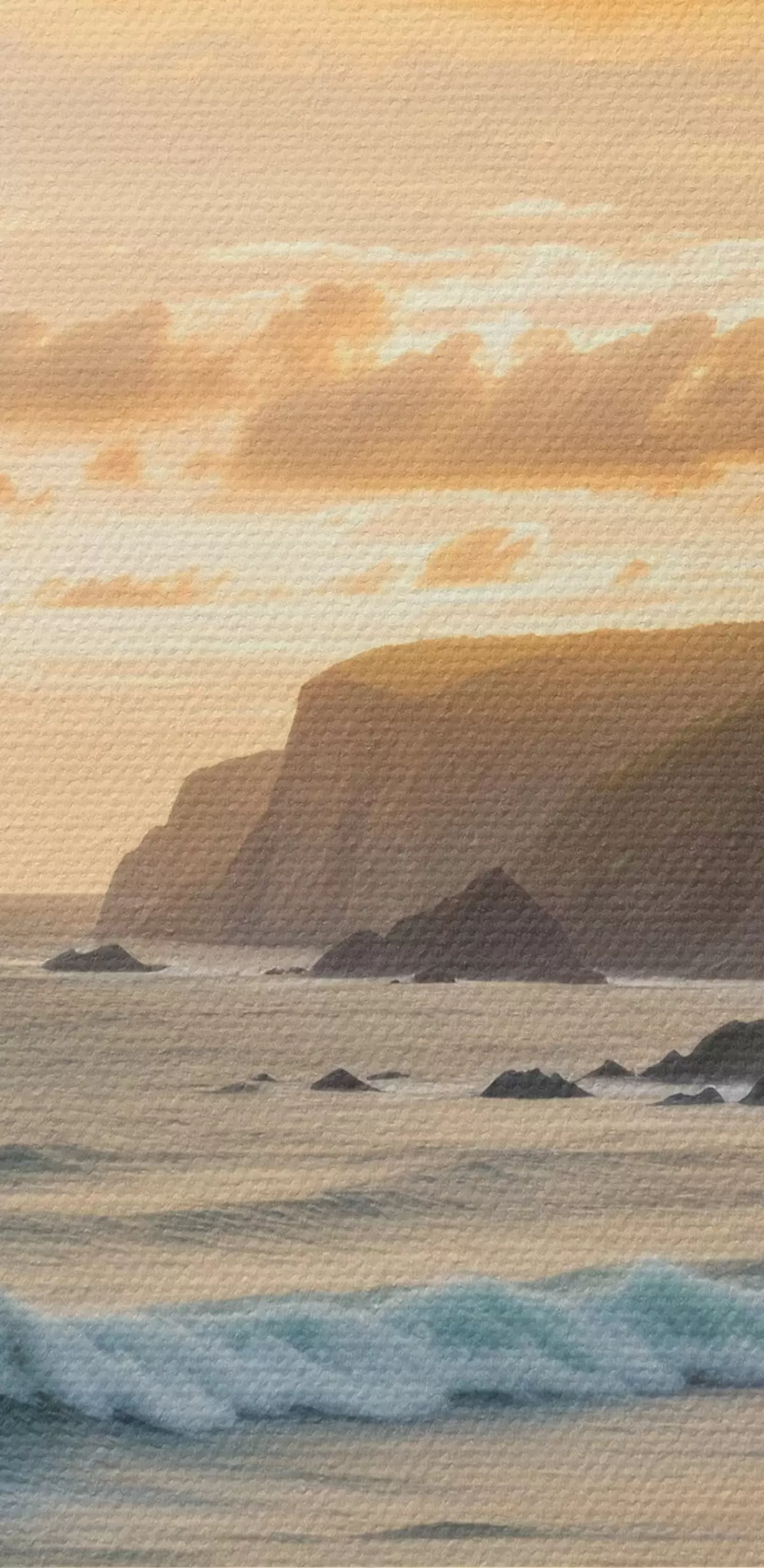 Ronde schilderijen Een schilderachtig kustlandschap met dramatische kliffen, beukende golven en een kleurrijke zonsonderganghemel Nr r40176