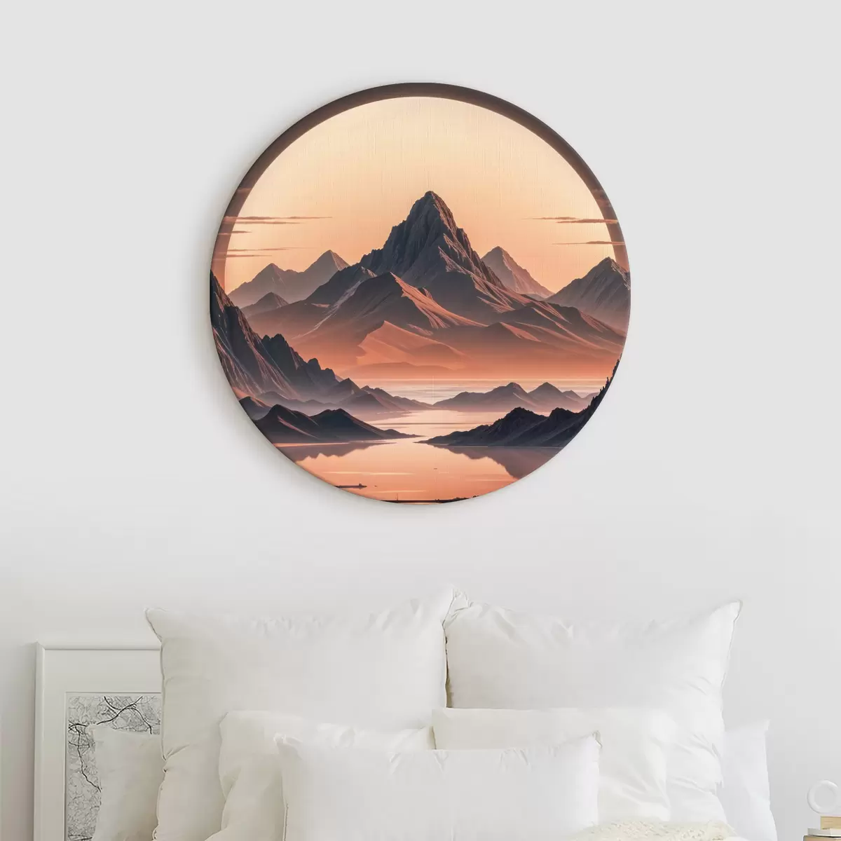 Ronde schilderijen Een dramatisch, futuristisch landschap met een grote, gloeiende maan of zon aan de hemel, omgeven door bergen Nr r40177