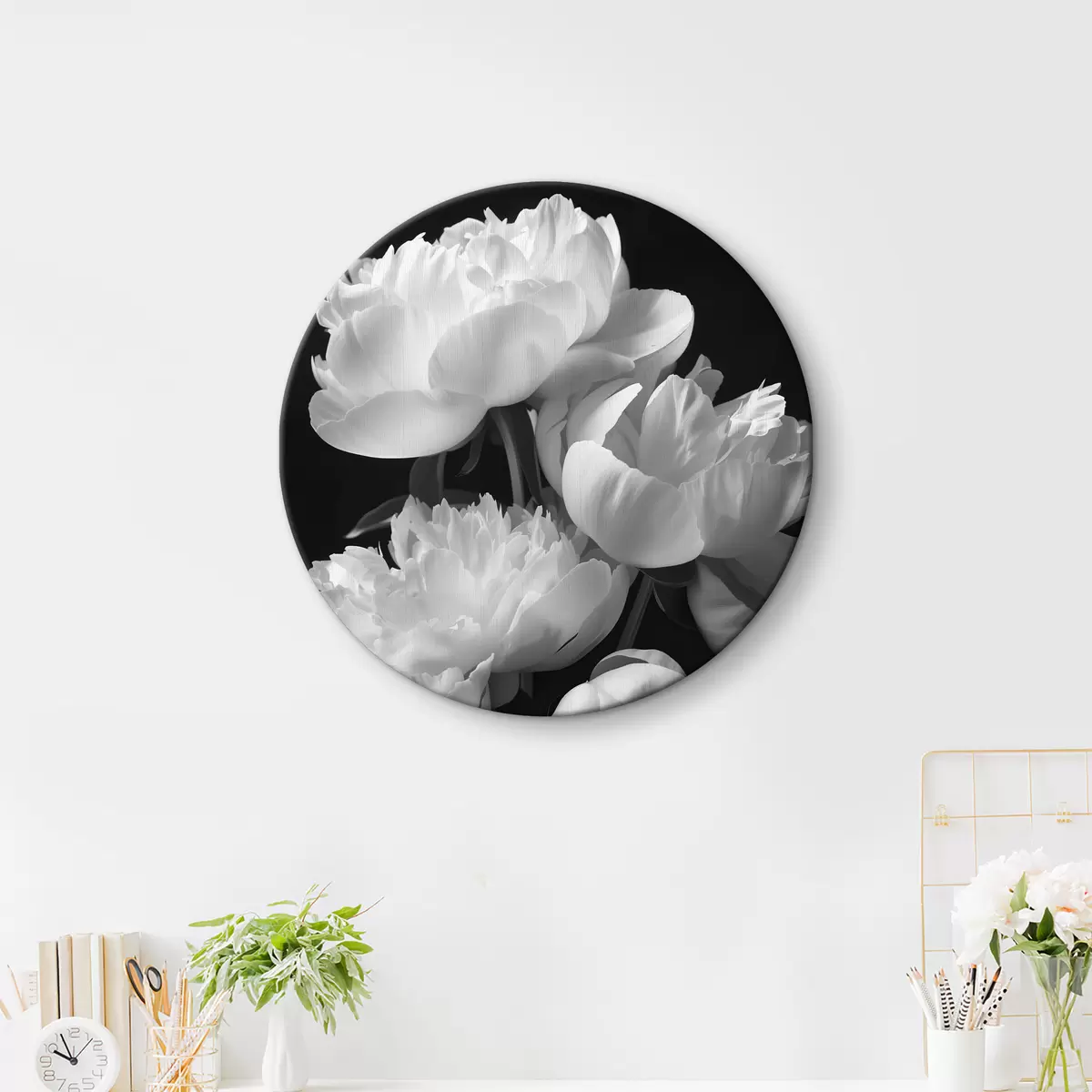 Ronde schilderijen Witte pioenrozen op zwarte achtergrond r40208