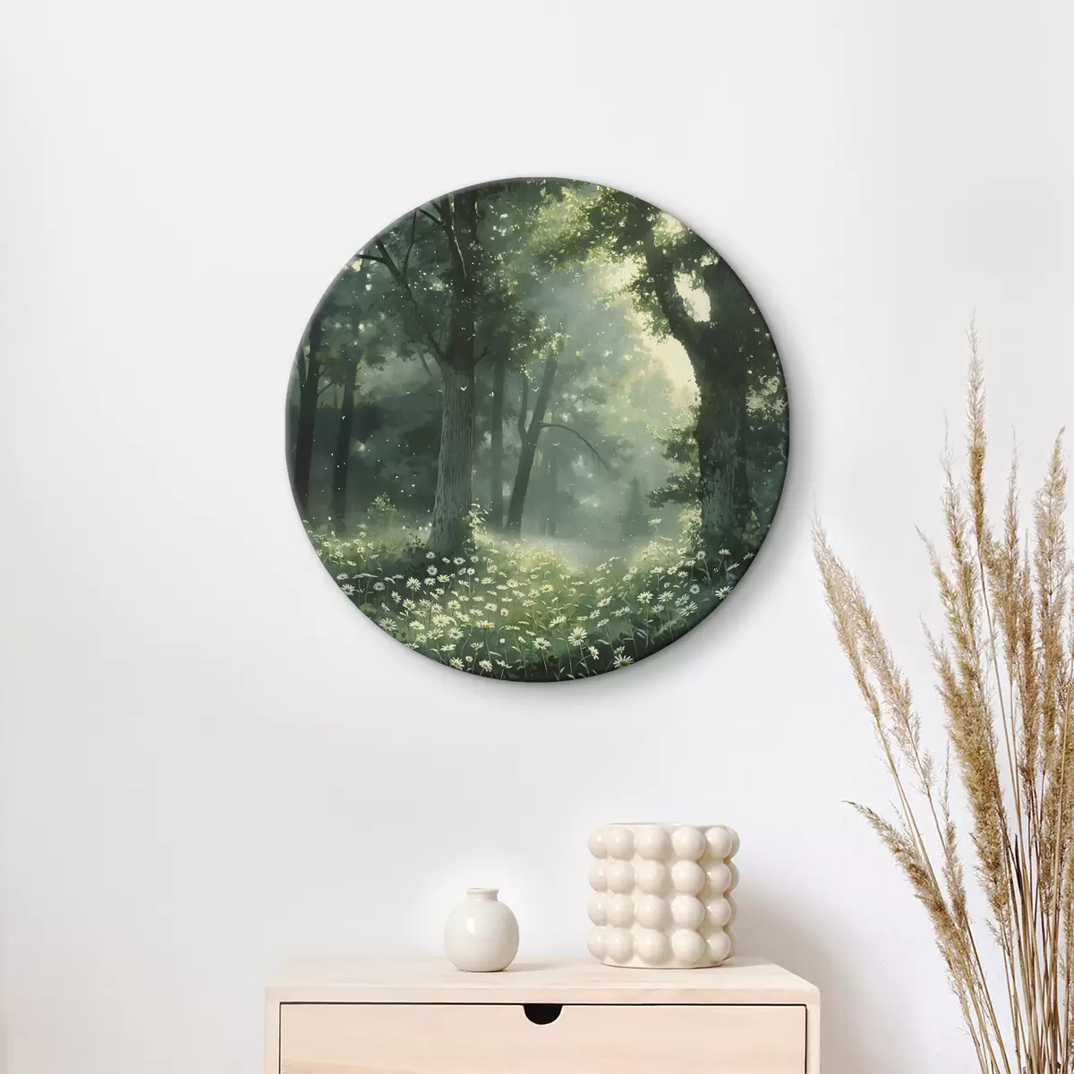 Ronde schilderijen Dicht bos met zonlicht in de bomen, kamillebloemen, groen gras, natuur Nr r40224