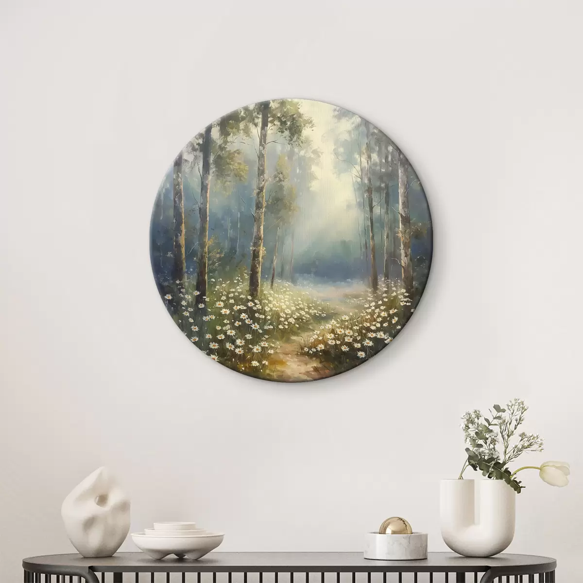 Ronde schilderijen Bos met berkenbomen en kamillebloemen, zacht zonlicht, natuurlijke kleuren, pastel Nr r40225