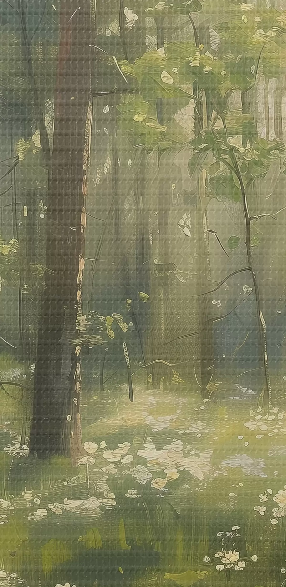 Ronde schilderijen Bos met zonlicht in de bomen, kamillebloemen, groen gras, acryltekening Nr r40226