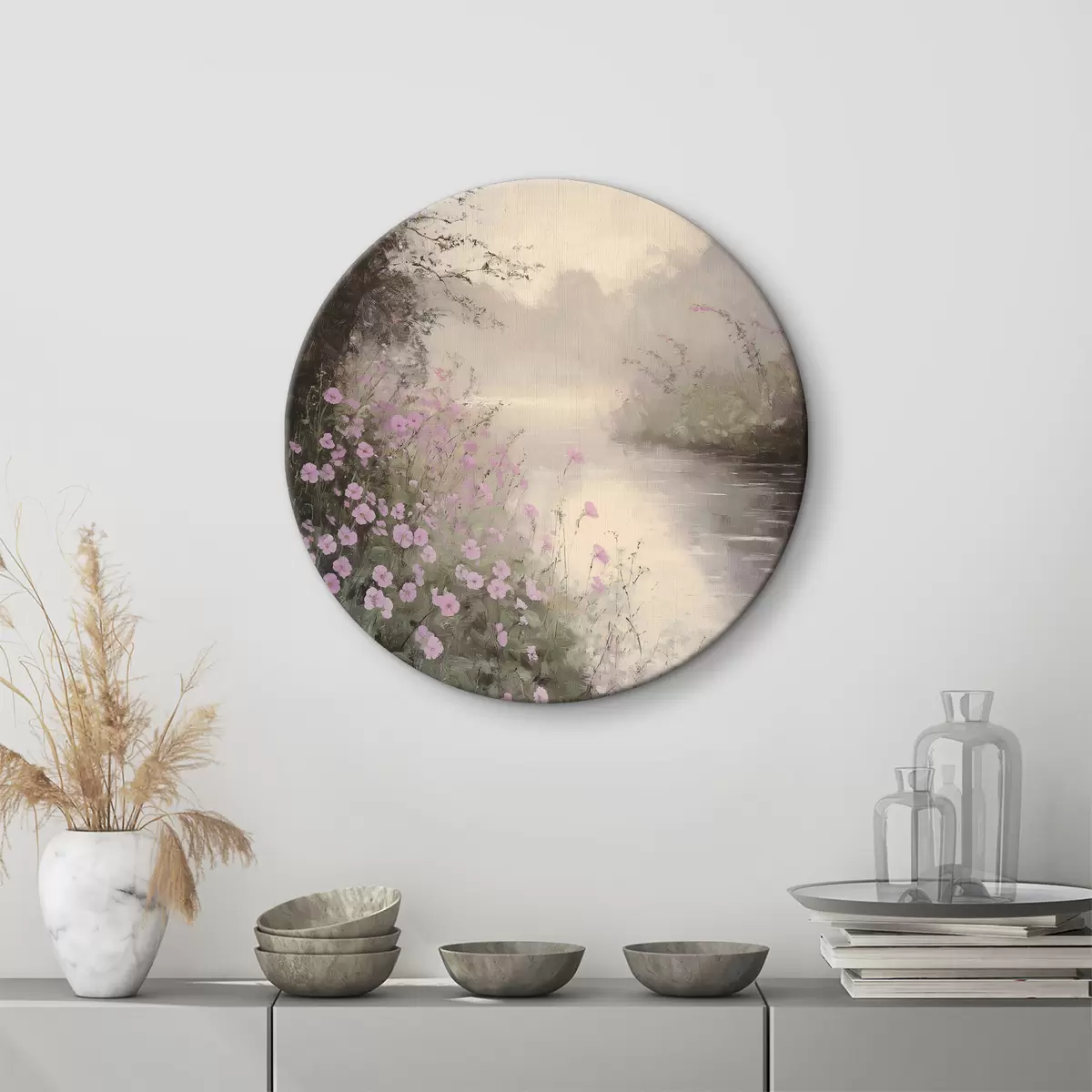 Ronde schilderijen Meer met roze bloemen, zonsopgang, olieverftekening, pastelbeige kleuren, mist Nr r40229