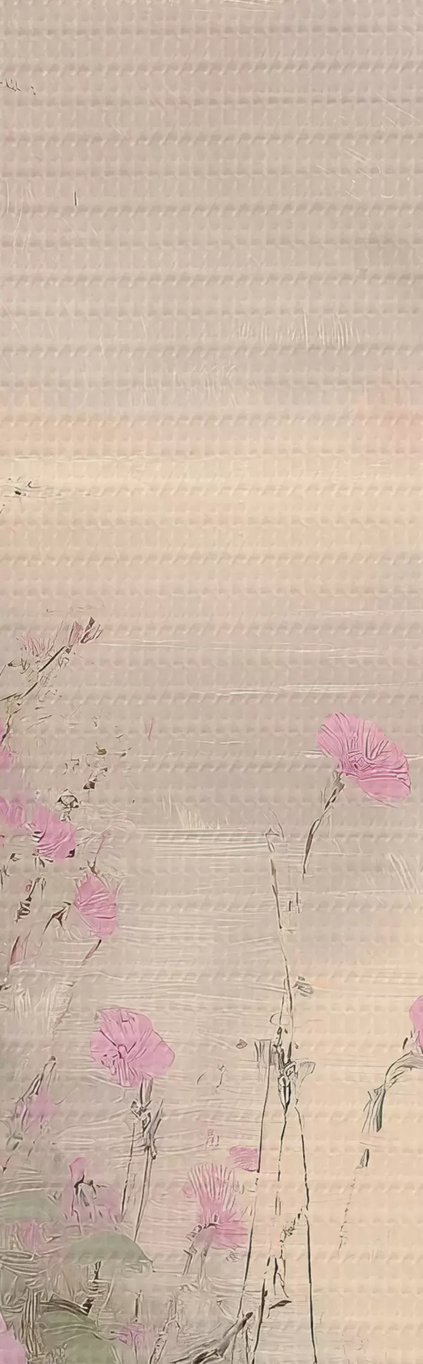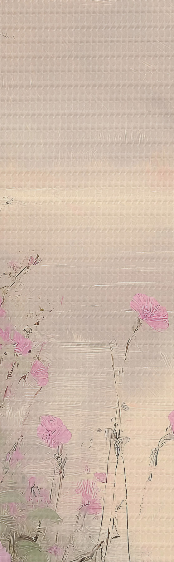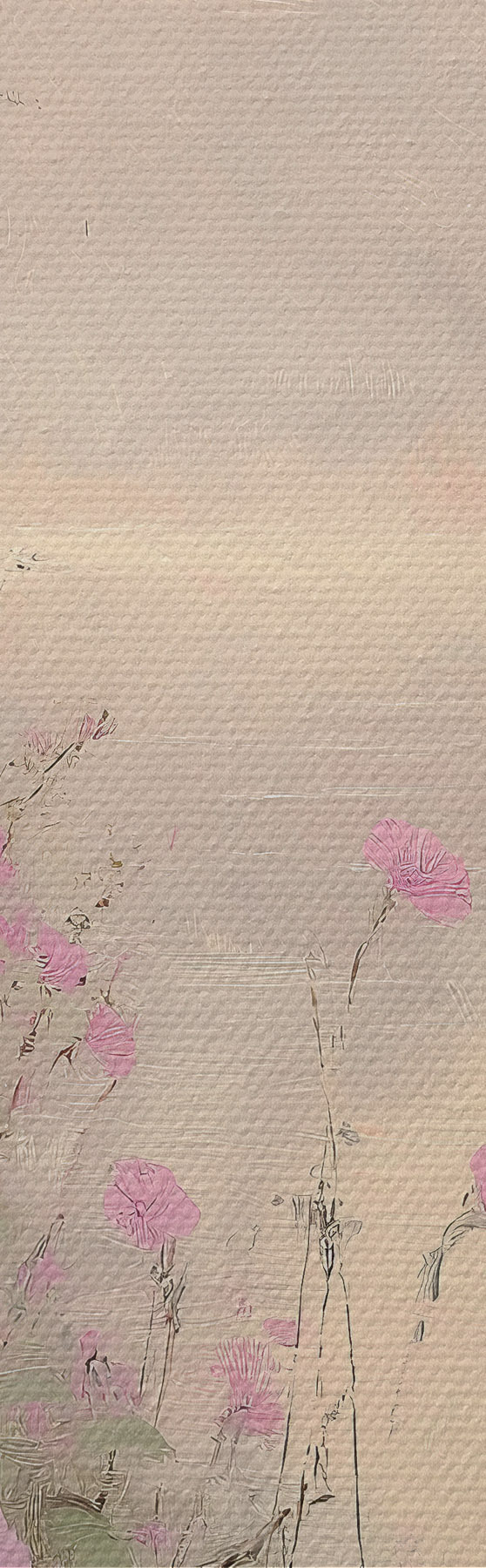 Ronde schilderijen Meer met roze bloemen, zonsopgang, olieverftekening, pastelbeige kleuren, mist r40229