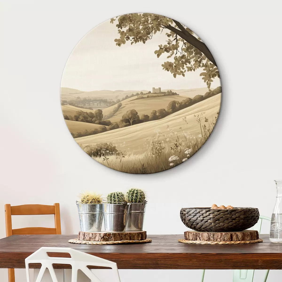 Ronde schilderijen Natuurlandschap in beige kleurenpalet, weide, bloemen, bomen, kasteel Nr r40230