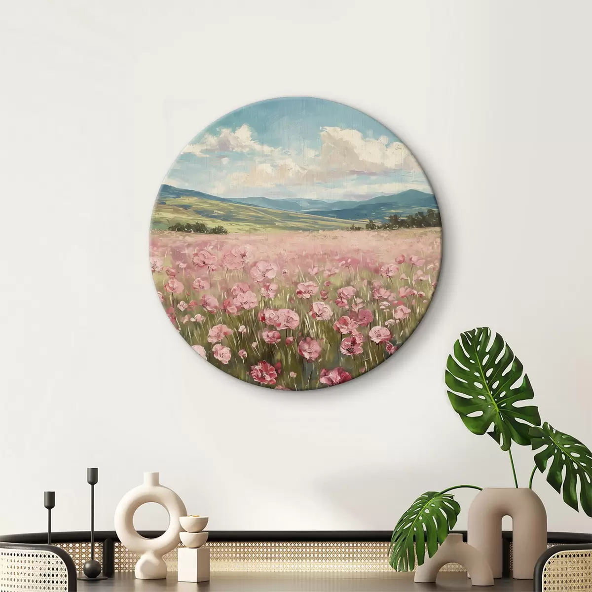 Ronde schilderijen Weide met roze bloemen, bergen, natuurlandschap, blauwe lucht met wolken, acryl r40232
