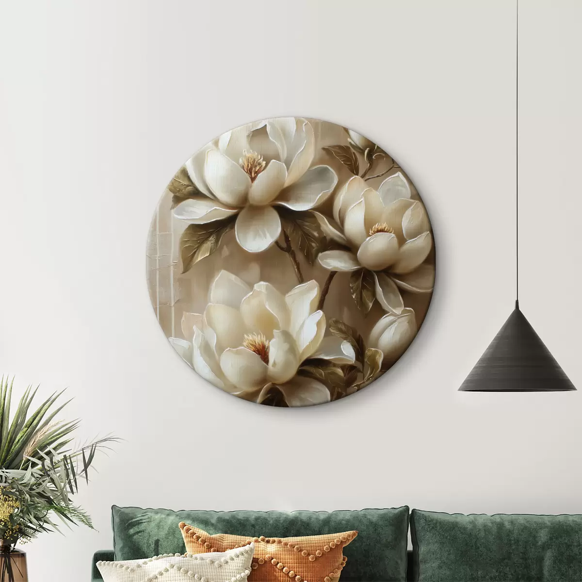 Ronde schilderijen een tak met bloemen in beige tinten Nr r40263
