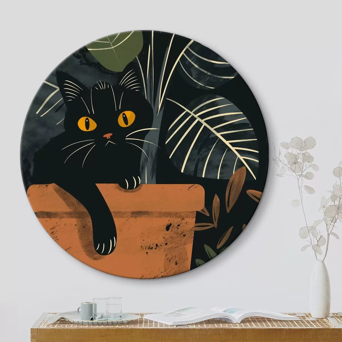 Ronde schilderijen Kat in een pot met een bloem Nr r40268