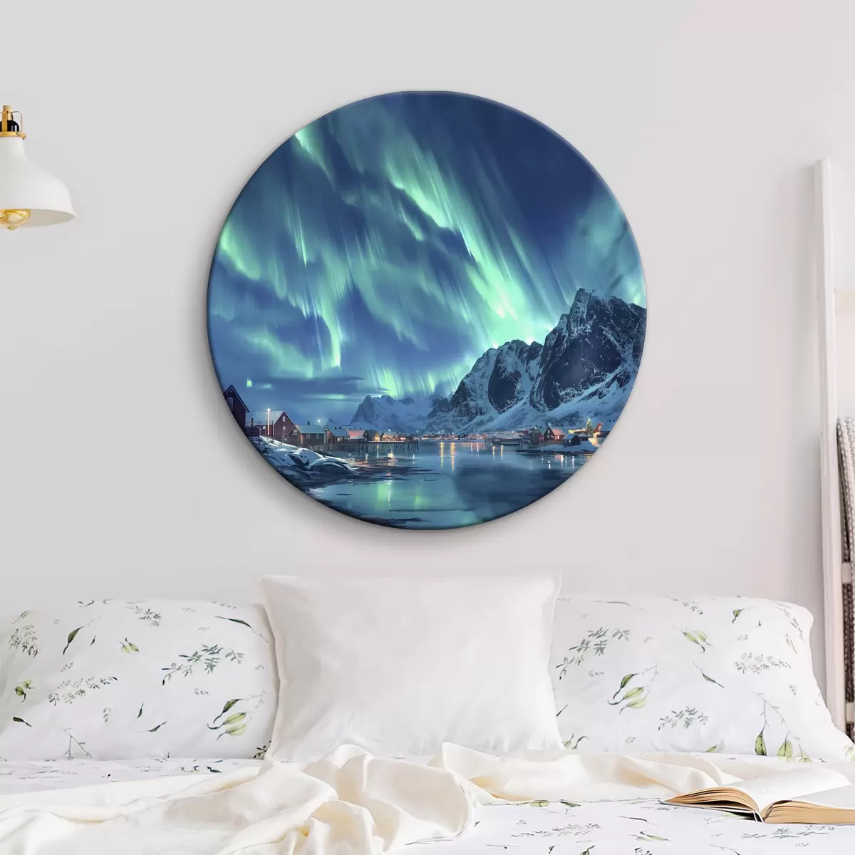 Ronde schilderijen Noorwegen winterdorp, noorderlicht, nachtelijke hemel Nr r40300