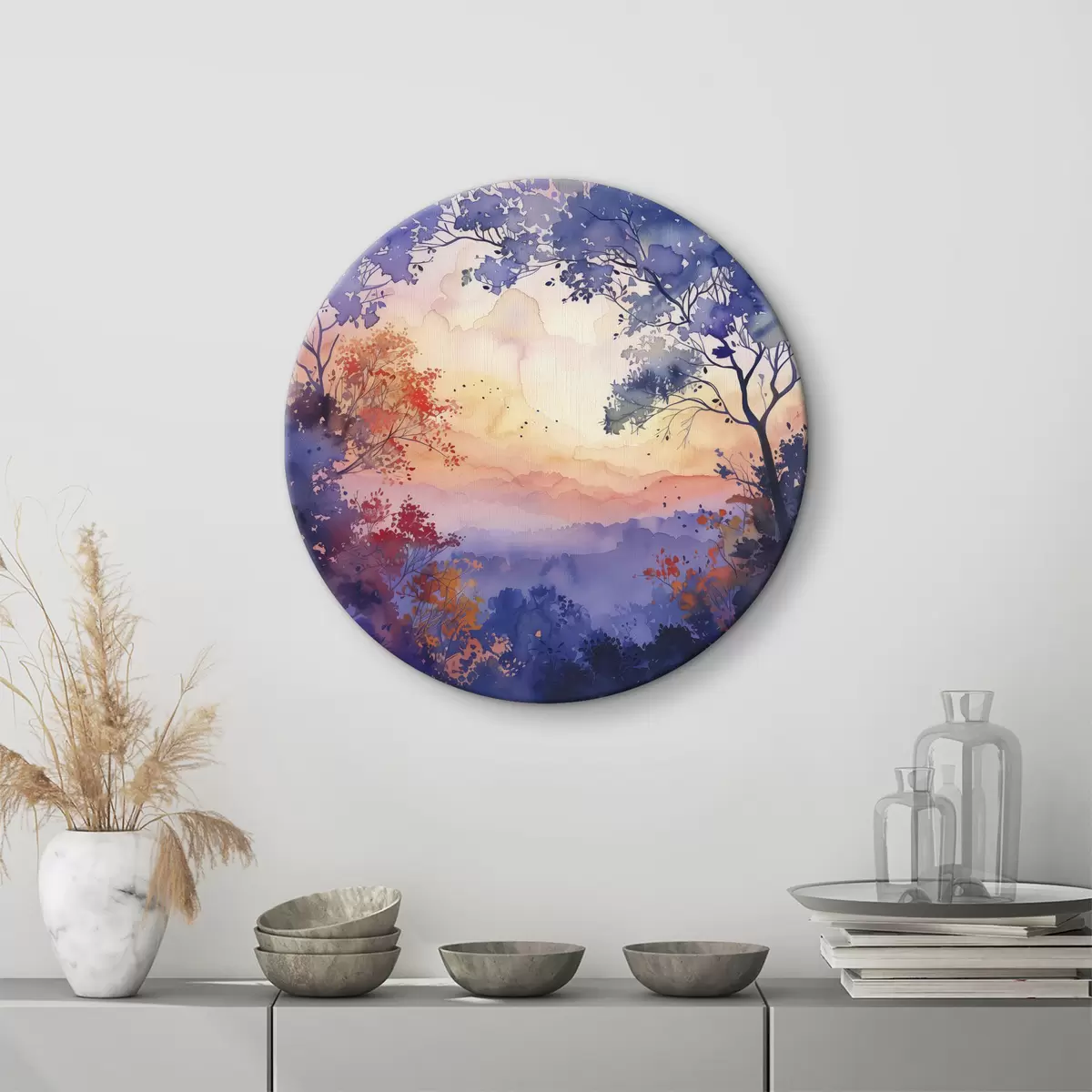Ronde schilderijen Aquarel bos, zonsondergang, boomtakken, paars en oranje Nr r40304
