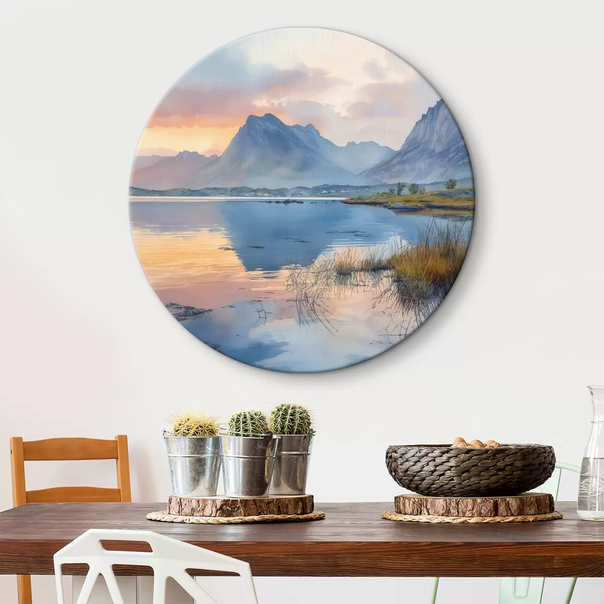 Ronde schilderijen Rustige rivier met bergen, zonsopgang, zachte kleuren Nr r40307