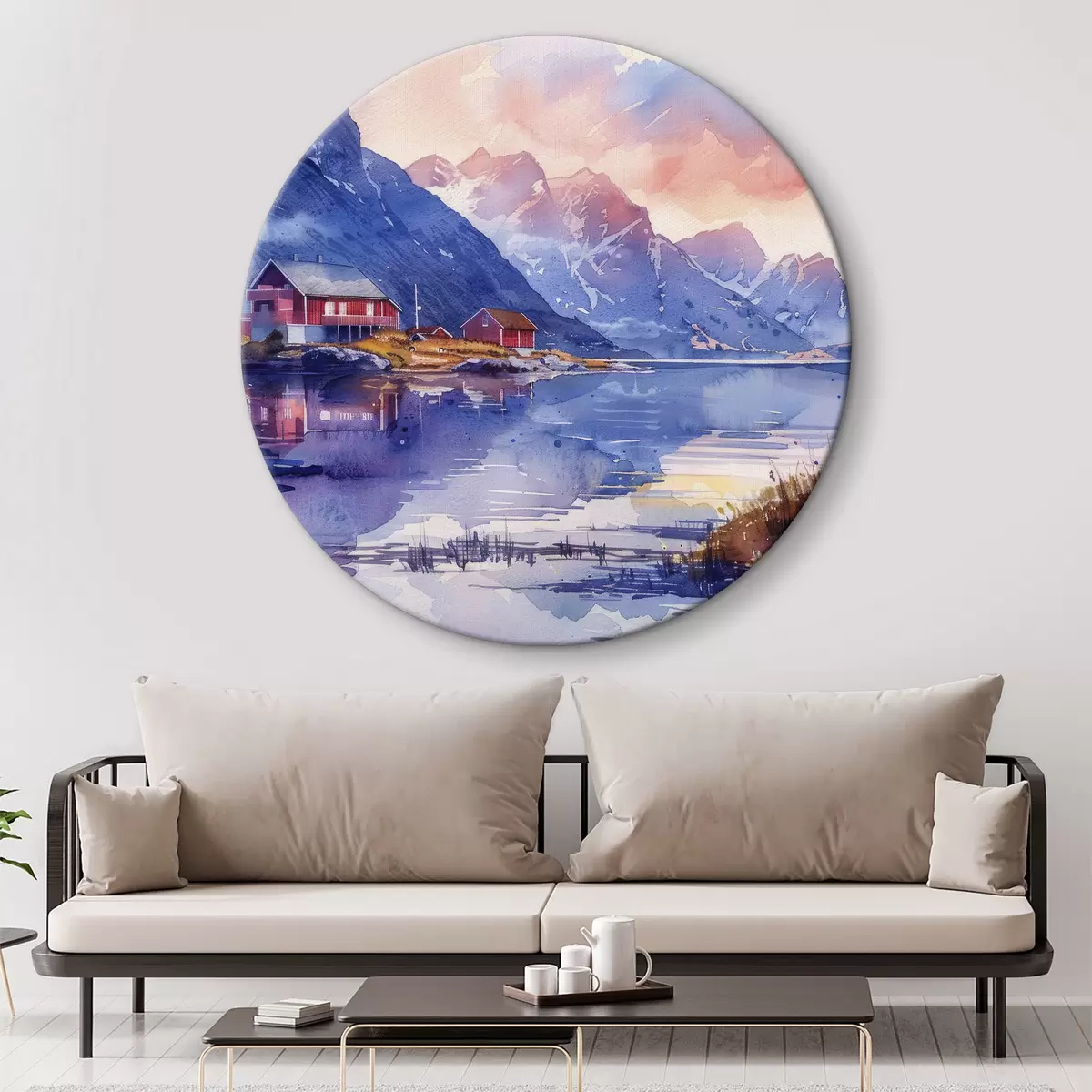 Ronde schilderijen Noors dorp, zonsondergang, kalme rivier, bergen, aquarel Nr r40311