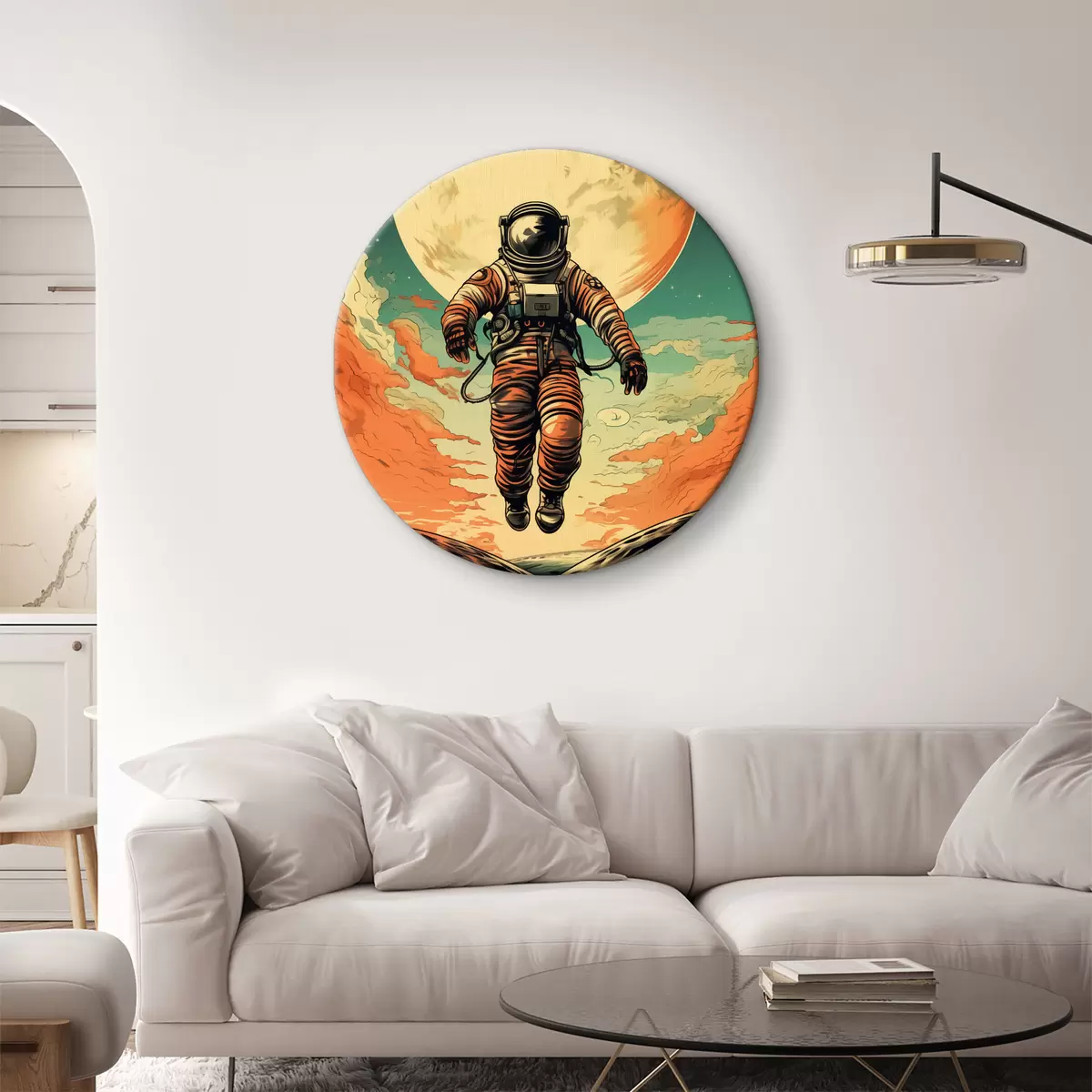 Ronde schilderijen Astronaut rent op asteroïde met maan op achtergrond, blauwe, rode en oranje kleur Nr r40313