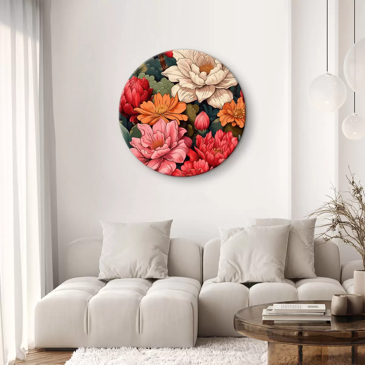 Ronde schilderijen Felgekleurde chrysanten, wit, groen, oranje, rood r40315