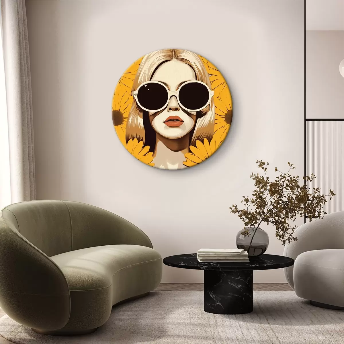Ronde schilderijen Meisje met grote zonnebril rond gele madeliefjes retro stijl r40317