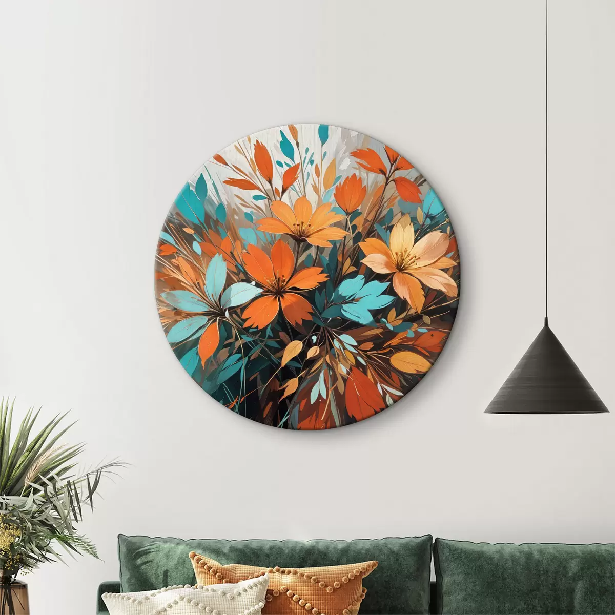 Ronde schilderijen Een levendig boeket van kleurrijke herfstbladeren in tinten oranje, geel en turquoise Nr r40392