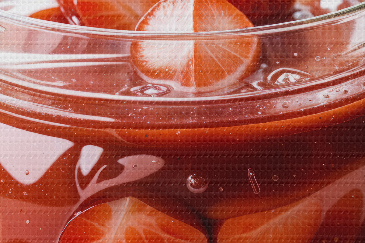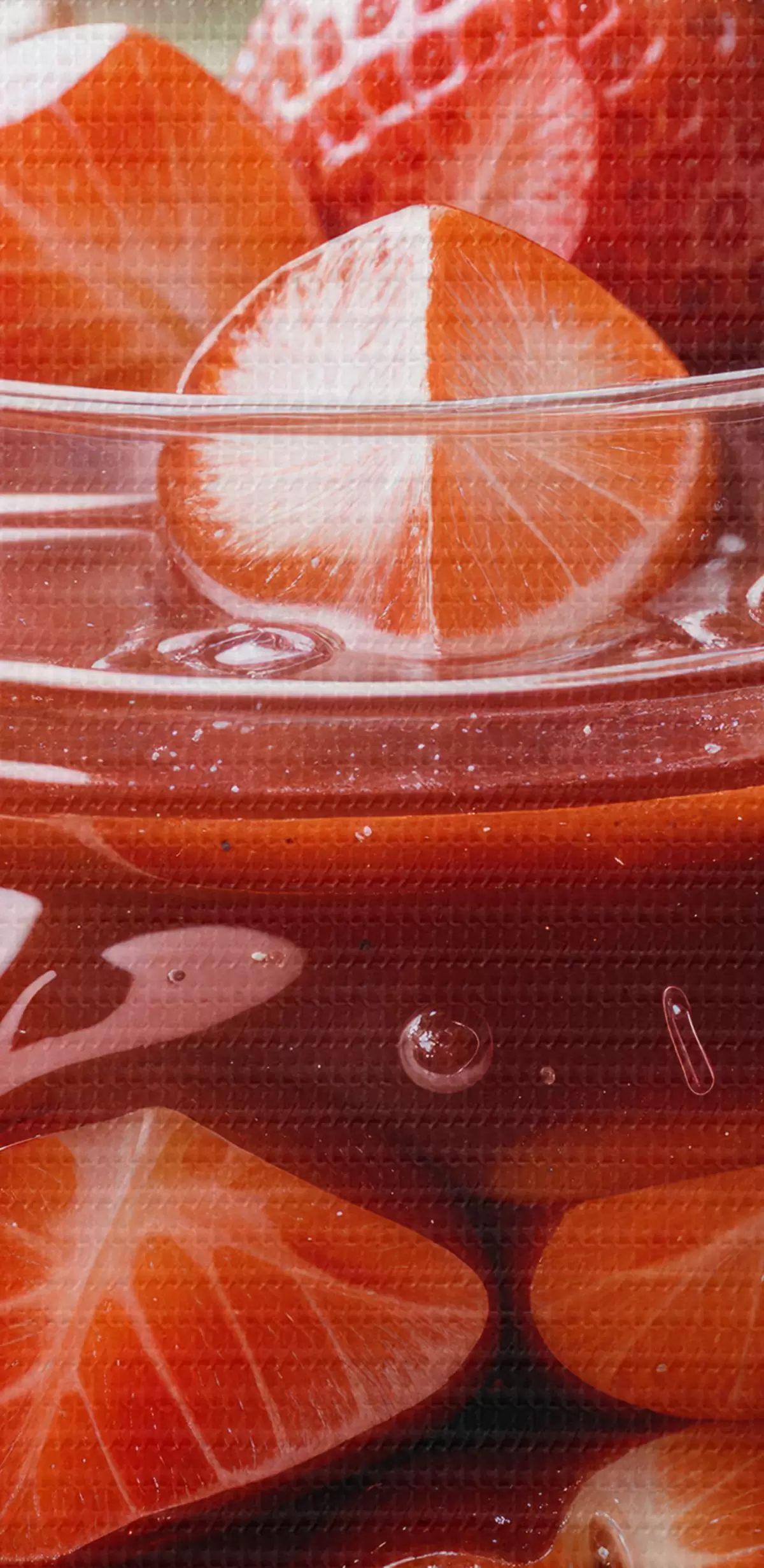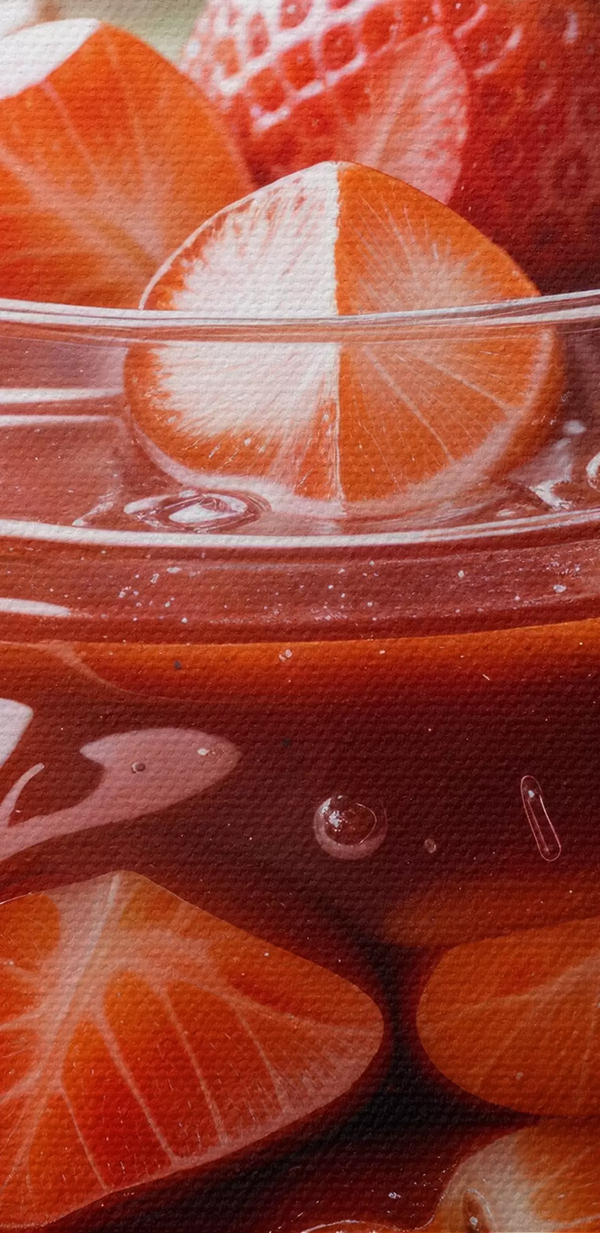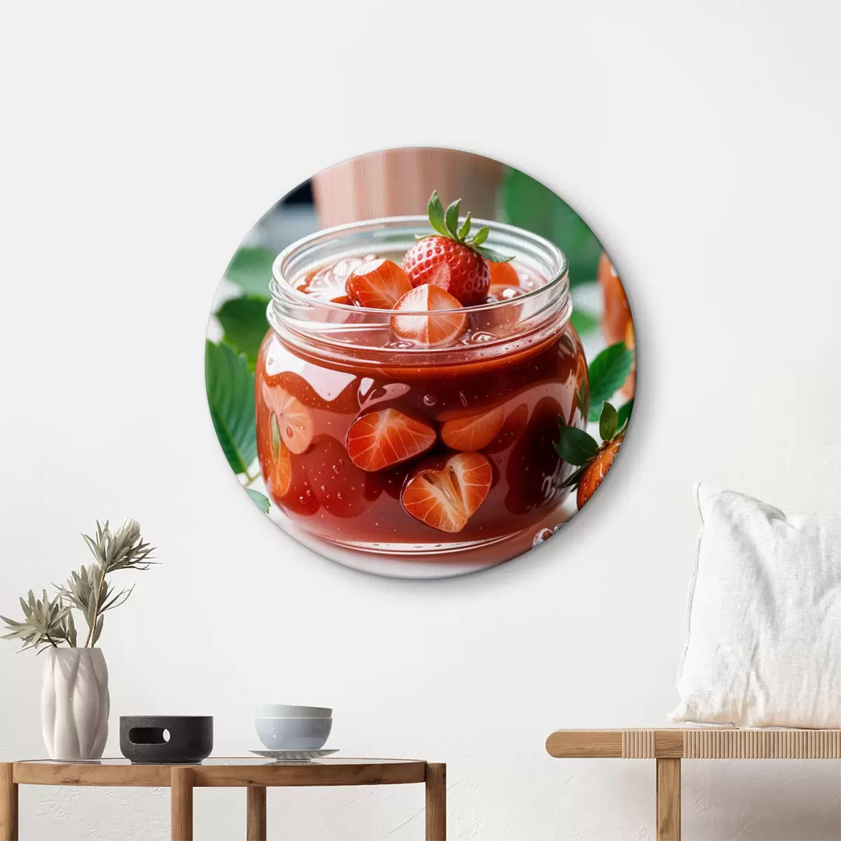 Ronde schilderijen Een glazen pot gevuld met verse aardbeien in een compote tegen een wazige achtergrond met wat groen Nr r40396