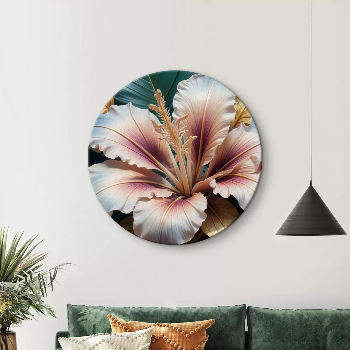 Ronde schilderijen Een levendige, veelkleurige tropische hibiscusbloem met grote, ingewikkelde bloemblaadjes in tinten roze, wit en geel Nr r40399
