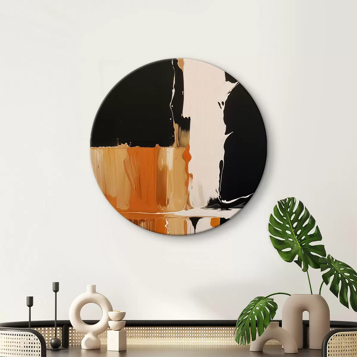 Ronde schilderijen Een donker abstract schilderij met opvallende penseelstreken in de kleuren zwart, oranje en wit Nr r40402